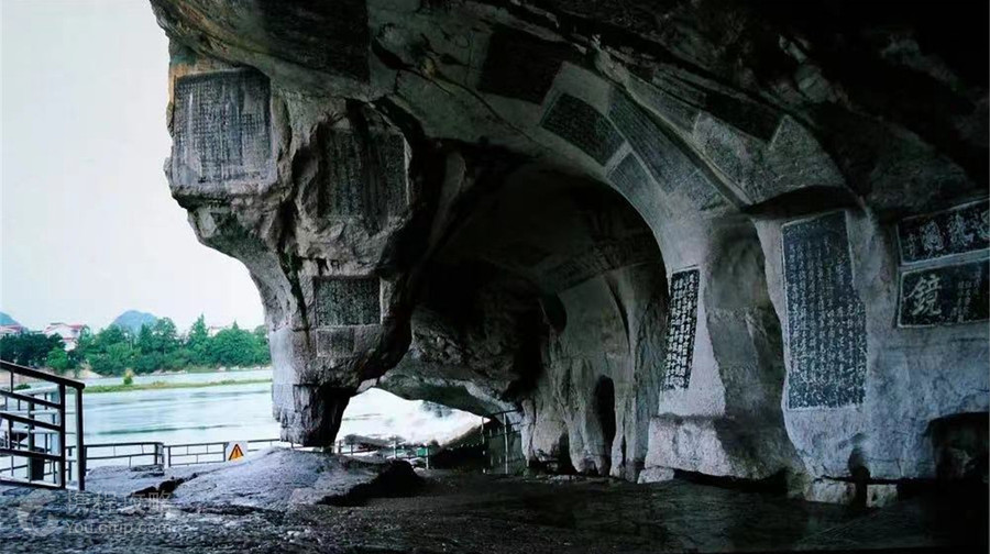 伏波山位于桂林市漓江之滨,是“两江四湖·象山” 5A级景区的核心游览区域。景区以历史文物闻名,集山、水、洞、石、庭院、文物六美为一体,步移景换,曲折有致,是桂林山水的缩影,素有“伏波胜境”的美誉。 伏波山海拔213米,相对高度63米,因其半枕陆地,半插江潭,汹涌的波涛被山体阻挡而形成了巨大的回流,古人取其“麓遏澜洄”,意为降服波涛,被誉为“漓江的守护神”。东汉建武十八年(公元42年),光武帝派伏波将军马援出兵交趾郡。人们为怀念马援,在山上建祠奉祀,并以伏波将军名号作为山名,马援将军曾保桂林一方平安,所以伏波山也被称为“伏波平安地”。景区内主要景点有平安榕广场、伏波晚棹牌坊、癸水亭、公主钟亭、还珠洞、伏波山-试剑石、摩崖石刻(米芾自画像、鹿鸣宴诗)、摩崖造像(唐代佛教造像、道家造像)、伏波山-千佛岩、千人锅、听涛阁、元代河堤等等。 【伏波晚棹】 伏波晚棹是解放后兴建的仿石牌坊,横额“伏波晚棹”是当代文化名人楚图南先生手手笔。古时漓江水位高,古人游览伏波山,得摇着小船来。傍晚时分,站在江边可以看见非常美丽的风景,青山绿水、竹筏鱼鹰、袅袅炊烟,还能听到从远处传来的寺庙钟声。所以广西布政使彭而述就有一首诗是这样写的:“伏波山下系江船,画角钟声破晓烟。无数青山浮水出,中流夜雨带帆悬。”这描写的是当时伏波山著名的一景——伏波晚棹。 【公主钟亭】 山脚下是景区内著名的公主钟亭,亭内的大铁钟铸造于公元1669年,整个钟重达2524公斤。钟顶为双龙钮,上层铸有佛教的《波罗蜜多心经》,钟身铸有铭文,分别为“皇图巩固”、“帝道遐昌”、“佛日增辉”、“法轮常转”。它是清朝历史上唯 一的一位汉人格格和硕格格孔四贞为了纪念她的父亲平定粤西之功所建造的。 【千人锅】 千人锅位于江边的回廊上,也是景区内一件非常有名的历史文物。铸造于清康熙二年,公元1663年,与大铁钟同为和硕格格孔四贞在广东的佛山铸造的。在锅沿的两边,能看到一些模糊的铭文,它是以前定粤寺里的一件法器,供香客插香用的香炉。锅底有一处损坏的痕迹,是当年抗日战争时被日军的炮火毁坏的。桂林民间有俗语:“绕锅转一转,财富千千万”。 【还珠洞试剑石及米芾自画像】 还珠洞高4-6米,总长127米,洞内刻有造型各异的摩崖造像45龛219尊,摩崖石刻108件,是广西重点文物保护单位,也是历史文化荟萃之地。特别值得一提的是,洞中有一根神奇的石柱,状若浮柱,上大下小、离地仅一线之遥,我们把它叫做伏波山-试剑石,也叫做状元石。民间有句俗语:岩石连,出状元,说的就是只要这块石头每与地面相连一次,桂林就会出一位状元,而自从有科举制度以来,桂林一共出过8位状元。 米芾自画像是整个还珠洞内的珍贵石刻。石刻上题写“潘景纯 米黻(fú) 熙宁七年五月晦日同游”。是北宋大书法家米芾与友人潘景纯游览还珠洞后所题写的。多年后,文人方信儒游览还珠洞内,发现了米芾这一题刻,非常兴奋。正巧当时,收藏了这幅自画像的米芾的曾孙米秀实在静江府任职,于是方信孺将画像借出,摹刻在了米芾题名的右侧,米芾的传世作品非常稀有,在还珠洞内,我们不仅能看到米芾的题刻,还能看到米芾的自画像,这是非常难得的,是广西重点保护文物。 【癸水亭】 “癸水绕东城,永不见刀兵”。癸水意为漓江,南宋诗人范成大时任静江知府,在伏波山北临水处建造癸水亭,并赋诗“愿挽江流接河汉,为君直北洗檐枪”,以期盼四方和平,百姓安居乐业。