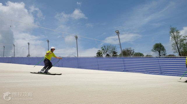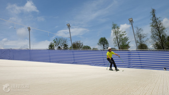 旱雪小镇位于佛山市高明区美的·鹭湖森林度假区·探索王国内,分为滑雪俱乐部和滑圈两大类。滑雪俱乐部拥有4条滑雪道,包括初级滑道、初中级滑道、中级滑道和中高级滑道,适合身高1.2米以上(含1.2米的),60岁以下游客参与;滑圈拥有2条滑圈道,一条初级滑道,一条高级滑道,适合身高1米以上(含1米),60岁以下的游客游玩;雪道总长度超过600米,均采用“尖锋旱雪”作为场地设备,安全、刺激,做为仿真雪的雪上娱乐项目,圆头形的旱雪表面既可以提高滑行速度,又可以增加缓冲,让游客更加安全的参与滑行体验,可大程度满足游客在无雪季节的滑雪体验。在广场有美食饮料,提供各种美味食物,让游客在满足激情体验的同时享受味蕾的刺激。同时雪具大厅的商店还提供滑雪装备和纪念品,畅玩之后还能把欢乐带回家。