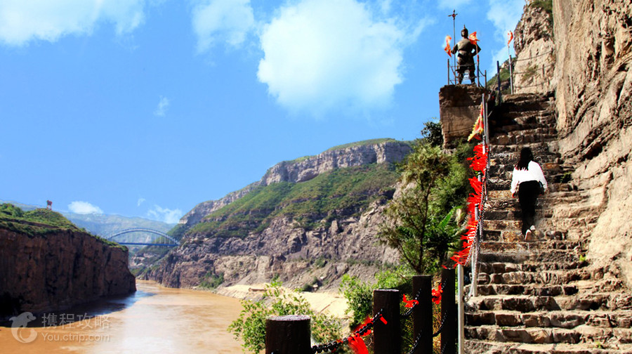 黄河大梯子崖位于山西省河津市,黄河龙门风景区与石门之间。北望石门,南眺龙门,西临黄河,东居吕梁,山河壮丽,风景独特。黄河大梯子崖其核心景观—黄河大梯子崖,据相关资料记载,年代久远,可追溯到北魏时期,壁上凿痕虽历经风雨,但清晰可辨。它是在悬崖边依地势,人工开凿的之字形古栈道,由365个台阶组成,梯宽四五尺,每个台阶有七八寸高。在空中鸟瞰黄河大梯子崖的整体形态就如在一块竖长的石头上雕刻出365个台阶一样,地形险峻、风景独特、巧夺天工,令人震撼。黄河大梯子崖上的红色往昔:1938年12月23日,盘踞河津的日军,以七、八联队附滕田大队为基干,加上伪军等共四、五千人,大炮二十多门,由空军配合进攻新八师东龙门山及禹门口前沿阵地,新八师官兵奋勇抵抗,多次打退日军进攻,日方伤亡惨重,新八师前沿阵地官兵伤亡亦达70%以上,其中守卫云中寺的一个加强排,全部壮烈牺牲。前沿多处阵地一度失手。30日,新八师朱振民副师长命令二十三团翻山越岭,由师家滩渡河增援,从龙门山侧面(黄河大梯子崖)向日军发起攻击,收复龙门山所有阵地。此役对日寇予沉重打击,毙伤日军200多人,迫使其龟缩河津、秸山两地。新八师阵亡连长以下黔籍官兵271名,合葬于陕晋交界处的龙门山麓(此地在属山西省河津县),1987年河津县政协在墓前修建一座纪念碑。黄河大梯子崖上的美丽传说:传说大禹当年治水到达这里后遇到恶龙阻挡,无法继续施工,于是修了黄河大梯子崖这通天的石梯,打算上天向玉帝告状,结果天梯修好后上来发现还是上不了天庭,然后观世音菩萨看到了,不忍心百姓受苦受难,所以点化大禹登入天庭,然后见到了玉帝,玉帝派天兵天将下来将恶龙斩杀,扫除治河障碍。大禹带领民众日夜奋战,很快便凿开龙门,使漫漫洪水流入大海。现在黄河大梯子崖上观音佛龛旁的岩壁上留有一个赤脚印,传说这便是大禹当时登入天庭留下的。桃花谷桃花谷,顾名思义,早春时节漫山遍野的山桃花争相斗艳,因以为名。谷内清静幽雅,植被丰茂,溪流潺潺,瀑布飘然,山石地貌形态万千。四季景色更是各有特色,春季漫山桃花争相斗艳,夏季满目苍翠,鸟语清脆,花香四溢,秋季醉人的红叶如丝带般飘洒在山谷的两侧,冬季万物皆沉寂下来,积蓄力量,静待来年,若运气好,赶上一场飘雪,那真是仿佛可以洗涤心灵的美了。明修•栈道(玻璃栈道)明修·栈道:「明」取明慧之意,「修」为修行之意,「明修」即为明慧修行。栈道由108块三层钢化玻璃组成,恰与108颗佛珠数量相一致,我们将108颗佛珠的含义与其相融合,愿大家在人生的这场修行中都能如意自在~玻璃栈道长约230米,垂直高差约150米,是抵达桃花谷的最佳路径。途中游客朋友在体验空中漫步的同时,还可以欣赏飞流直下的桃花谷瀑布。