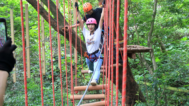 罗浮山丛林穿越是在树上进行的一项户外运动,集运动,娱乐,冒险,挑战于一身的户外体验项目。通过各种各样的障碍环节形成一条线路,挑战者要通过网道、步道、悬空桥梁、索道以及其他趣味十足的环节进行树木间的探险,其间采用跨、跳、爬、滑等动作通过障碍,到达终点。在整个项目过程中,集聚了力量、毅力、高空、速度等户外探险所必需的元素,为体验者提供了非常有趣的感官享受,有助于培养披荆斩棘的工作作风,不怕艰苦坚持到底的风格,锻炼一路攀高的无畏精神,展现团结一致相互协助的团队精神。同样也是培育青少年心理素质的有效方式。