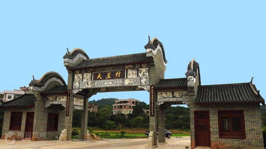 大芦村民俗风情旅游区素以其规模恢宏的古民居建筑群、流传数百年楹联文化及其土特产“三月红”荔枝、“大芦”椪柑而享誉四方,因此号称“荔枝村”。村出产的“三月红”荔枝和椪柑以其色鲜、质优、味美而享誉国内外水果市场,深受各地消费者的欢迎。大芦村的古民居建筑群建于明朝和清朝,建筑面积4.2万平方米,由镬耳楼、三达堂、双庆堂、东园别墅和劳氏祠壶等九幢古宅建筑组成,均属岭南派民居建筑,讲究装饰,梁柱、斗拱、檐沿、墙头、柱基、屏风、门窗等有许多精美的艺术装饰,图家雕绘技法高超,建筑群保存完整,在厅门、堂内等处至今仍悬挂诰封匾、贺赠匾、科名匾、吉句匾等牌匾十多块,有着重要的历史研究价值。古民居建筑群内存明、清两朝的对联近百幅,建国后创作的对联200多幅,有着其丰富的文化内涵。该古宅依山傍水,古静幽深,藏有文天祥手迹等大量的文物珍品,见证着历史的辉煌,宝贵的是这里藏有三百多副明、清时期创作的传世楹联,有着珍贵的人文历史研究价值和欣赏价值。一系列人造湖分隔开的明、清建筑群镬耳楼、三达堂、东园别墅、双庆堂、蟠龙堂、东明堂、陈卓园、富春园和劳克公祠,建筑占地总面积22万平方米,保护面积45万平方米。鸡犬之声相闻,宅旁湖畔寓意“文章显世,红顶当头”的古陛木树、樟树和荔枝树,犹如巨型盘景,往来曲径通幽,恬澹祥和。古宅群规模庞大,结构功能齐全,规划水平较高,生态环境优良,民俗文化积淀丰富。珍藏着许多文物,保留着一些“十里不同风”的习俗,活跃着一批黯然民间音乐舞蹈的艺人,1999年被授予“广西楹联第一村”称号。大芦村民俗风情旅游自2000年国庆开放以来,以其古、朴、奇、特的民俗风情吸引了众多游客,至目前止,已接待国内外游客3万多人次。