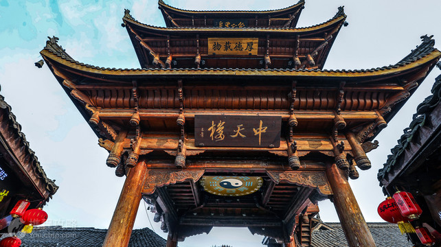中天楼是一座始建于唐朝的三层明清建筑风格的木质高楼,楼高25米,在一大片古城区中拔地而起,气势恢弘,建造精美。它是阆中古城地理位置的中心和布局的关键所在,古城的街道就是以它为中心的,以‘天心十道’的形式向四面八方次第展开,因此也将之称为“阆中地理中心”。它位于阆中古城的双栅子街、北街、西街和武庙街的交汇处,又名四排楼,阆苑十二楼之一,是古城的环境布局坐标。它始建于唐朝,后被毁,2006年重建,楼高20.5米、共三层,楼门四通,它宏伟壮丽,气势非凡,与古城景观协调统一,从古城四个方向均可饱览它的丽姿;登上楼顶,视野开阔,古城的环境格局尽收眼底。
