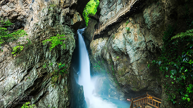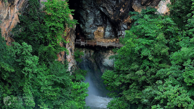天生桥处在老君山下,距神农坛4.8公里的地方,发源于老君山的黄岩河流经此地,经过千万年地表水和地下水的流动、冲刷、溶蚀形成今天“天桥飞渡”的模样,黄岩河从葫芦状的孔洞下流过,势若蛟龙、气势恢宏。相传太上老君炼丹在此取水时正值山洪暴发,老君将手中的拂尘架于黄岩河两岸,立即变成石桥,从此山民们不再受洪水的危害,因此这座石桥也被称作“幸福桥”。天生桥景区的奇洞、奇桥、奇瀑、奇潭尤其迷人,飞瀑风情万种、天然石桥鬼斧神工、兰花山飘香、石壁栈道险峻奇特,形成了一道靓丽的风景。这里山岩叠嶂,长满野花绿树,因遍生兰草,幽香四溢,起名为兰花山,从岩石上流下的飞瀑,急奔而下,如花飞溅,如鼓似笋,十分奇特。穿过树林来到这里,看河水冲击着岩石,激起阵阵水花,升起蒙蒙白雾,置身前下,地潭宛若天然浴盆,池水清澈见底,波光粼粼。穿过九泉幽谷来到天潭,这里生活着各种珍稀鱼类,如黄骨鱼、巨型鲵等。天生桥景区内留存着原始巴人的生活足迹,景区牌坊是石头砌成的,四周还有原始巴人茅屋,具有原始古朴的风格,穿过小茅屋站在逍遥桥上,是观天生桥景色好的地方。