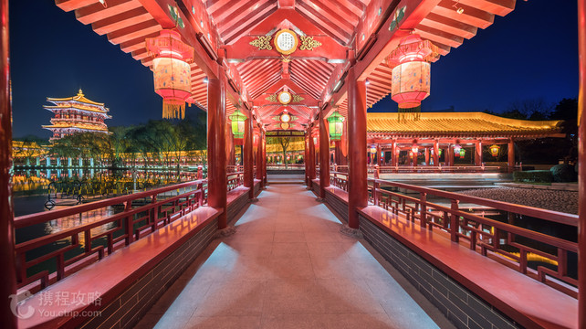 国家5A景区大唐芙蓉园,坐落于西安城南的曲江新区,与大雁塔遥遥相望,占地面积为998亩,其中水域面积300亩,绿地面积440亩,建筑面积近 10万平方米。园区建筑由中国工程院院士张锦秋先生担纲总体规划与建筑设计,日本园林大师秋山宽先生承担园林景观设计,是一个全方位展示盛唐风貌的大型文化主题遗址公园。自2005年4月11日(农历三月初三)正式对外开放以来,一直致力于打造高品质、高标准的品牌旅游景区。 大唐芙蓉园以建成“历史之园、精神之园、自然之园、人文之园、艺术之园”为目标,特别邀请了中国唐代文学学会的十多位唐史、唐诗、唐画、唐建专家、博士生导师、研究员以及旅游专家组成的专家小组对大唐芙蓉园的历史文化内容进行重新挖掘和整理,对全园景观进行了重新规划与定位,划分出了帝王文化区、女性文化区、诗歌文化区、科举文化区、茶文化区、歌舞文化区、饮食文化区、民俗文化区、外交文化区、佛教文化区、道教文化区、儿童游乐区、大门景观文化区、水秀表演区等十四个景观文化区,全方位再现了大唐盛世的灿烂文明。 园中亭台楼阁、雕廊画栋,包括有紫云楼、仕女馆、陆羽茶社、杏园、彩霞长廊、曲江流饮、丽人行、唐诗峡、茱萸台等景点二十多个,集中展示了唐王朝辉耀四方的精神风貌和璀璨多姿、无以伦比的文化艺术,被称为“国人震撼,世界惊奇”的旅游胜地。 园区主题演出大型水舞光影秀《大唐追梦》,乘船环游,共赴梦幻圣境;大型超维度情景舞剧《梦回大唐》恢宏大气,如梦似幻;唐代宫廷燕乐《鼓》,演绎人类非遗东仓鼓乐;以及新春大潮会、上巳节、曲江花月宴等精品文化旅游活动品牌及项目。每日多场免费景点精彩演出,是向游客发出的来自大唐皇家的盛情邀约,让他们能够震撼地体验到皇家文化的神圣恢弘。 作为一座品质卓越、富有个性、文化内涵丰富的主题遗址公园,大唐芙蓉园更是西安向世界展示长安古老历史底蕴和大唐盛世的一扇文化之窗和吸引世界了解中国的文化国门……