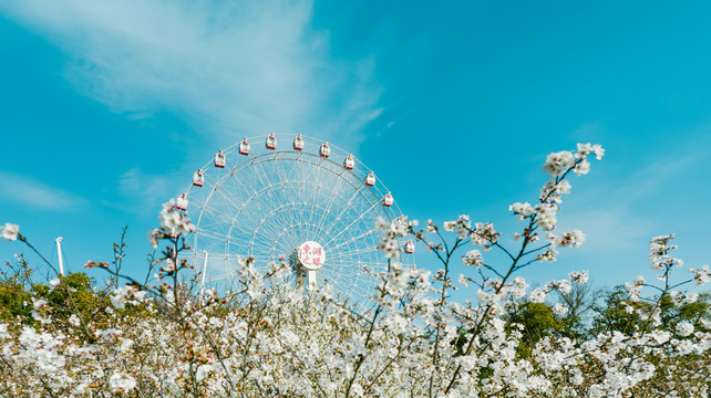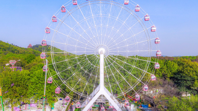 东湖之眼摩天轮是位于中国武汉市武昌区东湖磨山景区欢乐丛林内的一座摩天轮,这座摩天轮直径为49.9米,最高点离地面55米,转一圈的时间特别设定为13分14秒,寓意“一生一世”。摩天轮拥有28个樱花粉色系的座舱,每个座舱可容纳4人,总共可以容纳112人同时乘坐。座舱内配置有空调和自定义蓝牙音响,为游客提供舒适的乘坐体验。