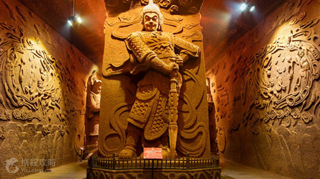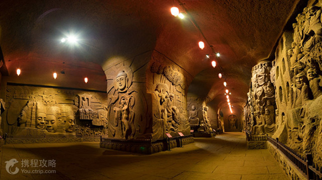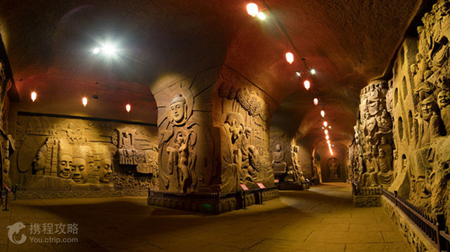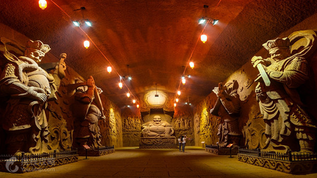 东方佛都,与乐山大佛一门相通,同在乐山市的凌云九峰,世界双遗产保护范围;辖山林地近千亩,是以大型佛像群为主体的国家4A级景区。东方佛都,林隐千佛,洞中百窟;是现代人,循唐代风貌,用传统石刻技法,留下的摩崖造像的痕迹。而今,世人称之为中国的第五大石窟群,一点不为过。景区自开放二十多年来,接待了上千万游客,得到了国内外众多著名行家的好评。景区的规划借鉴了中国的四大石窟群:敦煌、云冈、龙门、麦积山。这些佛像圣地,除一尊大佛闻名外,四周还有众多的石窟群,众星捧月,而乐山大佛,仅有一尊巨佛,有别于这四处,也有别于华夏建佛的传统。或许,海通当年凿乐山大佛时,也曾有过像四大石窟群一样的构想,只因乐山大佛过于宏大,凿造的工期耗时九十年,历经三代人,又加之经费短缺而未成就。或许,“峰各有寺”,香火鼎盛的唐代,凌云九峰就有四大石窟群一样的格局,只因后来的外患毁去。无论是先人未竟的事业,还是寻古复旧,都是今人应该去完成的宏愿。故而,这里在规划时,没随当时全国大搞微缩景观的潮流,而是以乐山大佛为核心,布局与其相匹配的大而美的佛像石窟群。其间,不乏借鉴了四大石窟群的部分精髓,结合本地实貌,规划出“林隐千佛,洞中百窟”的方案。此方案,得到了中国雕塑鼻祖、北京人民英雄纪念碑浮雕的设计制作者刘开渠大师的首肯,得到了卓越文物建筑家罗哲文、郭旃等人的签字认可。东方佛都的施工乐山大佛,是世界第一巨大的摩崖造像。所谓摩崖造像,就是在原石上直接凿造。它要与乐山大佛融为一体,也只能按先人传统的技法,摩崖造像,且佛像不能小。内行都知道,大而美的摩崖造像,是很难凿造的,这得需要雕塑家制作样品,匠人手艺精湛及得天独厚的山石。凌云九峰的山石,丹霞岩,内核无缝,几座起伏的凸峰,就像一坨完整的磐石,世间少有,天生就是凿造摩崖佛像的场所。海通当年选址于此,确实独具慧眼。东方佛都公司为了成就千秋大业,不惜花重金去四川美术学院,请当年创作《收租院》轰动全国的那批老中教授。前来主持造佛工程的四川美术学院雕塑系主任冯宜贵教授说:“四川美术学院集体做过两个大型雕塑群,一个是《收租院》,另一个就是东方佛都。”参加这里塑佛的四川美术学院老教授有郭其祥、王官乙、伍明万、龙德辉、冯宜贵及中年教授刘威、孙闯、谭云、袁成龙等雕塑家。参加凿佛的匠人,都是四川美术学院教授们带来的技工。李定红、唐启书等个人技艺都获得过国家奖证。这些雕塑家和技工,在佛像上献艺,历时多年,尤其是袁成龙教授主持实施的600多米长的地宫。众多的雕塑家和技工,在佛像上打擂比艺,各显神通。他们充分利用自然地貌,天赐神石,依山取势,采用圆雕、浮雕、壁画等多种形式,打造出了大小上万尊佛像。在凿造的过程中,难度很大的,是匠人在山崖上近距离作业,无法识别所凿佛像的局部与整体的比例。摩崖造像,又要求匠人一次成像,若鼻子打歪,原石上不能补缺,只能毁像重来。海通法师当年凿造乐山大佛的伟大,我们在实施建筑的过程中,才真正体会。即便是现在,我们用现代仪器,远处设观察点,用军用望远镜卡尺,卡算出佛像各部位的比例,用对讲机指挥施工,也很难加快工程进度。更难的是,建造之初,我们想当然地认为,先人凿造摩崖造像,是按乐山大佛陈列馆里井架林立的模型搭架施工的。殊不知,大谬不然。面对山崖搭架,施工中大块凿掉的石料,砸向井架,架塌伤人。实践中,我们才揣摩到,海通当年凿造乐山大佛,匠人是腰系绳索悬空作业,由上至下,一层一层剥下去的。看似简单的施工,行进中遇到的挫折不少。我们边摸索古人的技法,边艰难力行。它的特色这里囊括了世上的精品佛像,包罗了各派的佛文化内涵,与乐山大佛相得益彰,浑然一体。景区的佛像,林林总总,依山而就,错落有致,古朴自然;既大且美,远看气势,近看精细;尤其是地宫,金碧辉煌,群佛荟萃,简直就是山中的极乐宫殿。景区的植被,香樟成林,曲径通幽。亭榭疏落,野趣横生;精美的群佛,褪去人工痕迹,隐现于山林,既保留了原始的自然生态,又透现出丰富的人文情怀,再现了唐代凌云九峰。其观赏效果,正如景点创始人当年所憧憬的那样:“清水出芙蓉,天然去雕饰。”景区主要景点第一节 万佛洞中国很大的石窟群,总长700多米,在山洞里,气势恢宏,世上无双。洞窟由南往北,六个部分组成:南窟、南过道、中窟、北过道、北窟和地宫。其中地宫,游人见了无不叹为观止。地宫 殿 殿长36米,宽15米,高13米。四大高9米。四大是佛教的护法天神,中国佛教徒认为南方增长持剑,司风;东方持国拿琵琶,司调;北方多闻执伞,司雨;西方广目持蛇,司顺,组合起来便成了“风调雨顺”。释迦牟尼坐佛像 通高33米,是在世界上也算规模宏大的山中佛,在原石上雕刻而成。达摩祖师洞 通长56米,宽17米,高13米。达摩祖师,原印度人,为中国禅宗的始祖,故中国的禅宗又称达摩宗。达摩祖师像高10米。石刻八百罗汉 目前国内仅有,千姿百态,栩栩如生。药师佛洞 全洞长45米,宽23米。药师佛高51米。药师佛又作药师如来、大医王佛、医王善逝等,为东方净琉璃世界之教主。第二节 大佛湾三面群峰环抱,三重殿垂直下来,像一把龙椅。两旁的佛像从北魏至宋。第三节 观音窟媚态观音 高9米,姿态优美,婀娜端庄,有“东方维纳斯”的美称。 