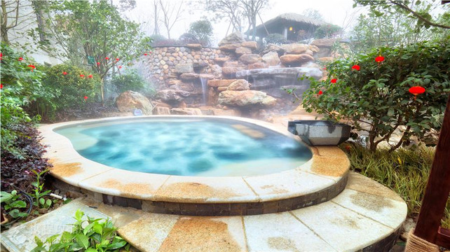 百灵温泉主要由室内、室外两大温泉板块9个温泉泡区、5大温泉系列、37个不同种类的特色温泉池、无边际泳池、水下健身池、石板浴等组成,日出水量1200多立方米,出水温度58℃,水质透明略带黄色。