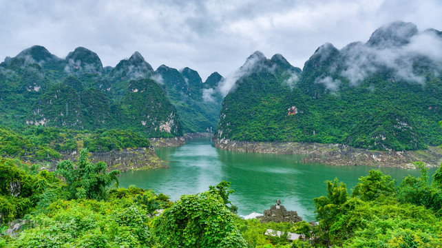万峰湖周围万峰环绕,因此而得名。万峰湖是国家重点水电工程——天生桥高坝电站建成蓄水后形成的人工湖。沿岸有众多民族山寨,其独特的民居、诱人的风情、还有那少数民族姑娘们的服饰、头饰以及情歌,都惹得游人驻足。 在万峰湖,大多数游客都是乘坐游船观赏。在船上一边呼吸新鲜的空气,一边欣赏碧绿的湖水和远处苍翠的山峦,非常惬意。这里还是垂钓者的乐园,鱼肥水美,垂钓者可以大展身手,一定会收获颇丰。 主要码头为红椿码头,不少游客都是从这里坐游船出发,而巴结镇海事管理局附近的渡口乘船是当地人去得较多的码头。