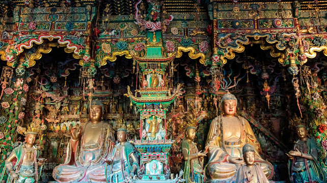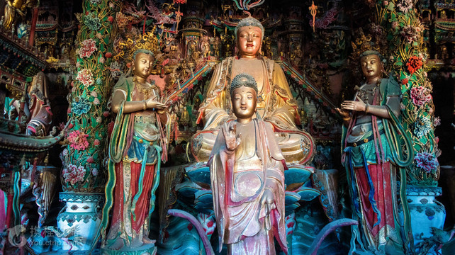小西天在山西隰县城西北1公里的凤凰山上,原名千佛庵,是一处佛教寺院,创建于明代崇祯七年(公元1634年)。寺内分上、下两院,两院内有很多色泽明丽、造型生动的塑像,堪称明代彩塑中的精品。下院有小西天-无量殿、韦驮殿、左右厢房和前向掖门等建筑。小西天-无量殿坐西面东,内有数十尊铜佛和木雕天宫楼阁。上院左右分别为文殊殿、普贤殿,正中为大雄宝殿。大殿内,满布大型彩绘悬塑,正面横排着5个互通的佛龛,5尊主佛端坐其中,左右两侧10尊弟子侍立。殿内,有33层天宫楼阁,彩绘色泽艳丽,雕梁画栋。殿内悬塑众多,人物造型丰满、生动,内心世界刻画感人至深,是明代彩塑塑造精美,充满韵味的珍品,至今色泽依旧,成为明代彩塑艺术的宝库。