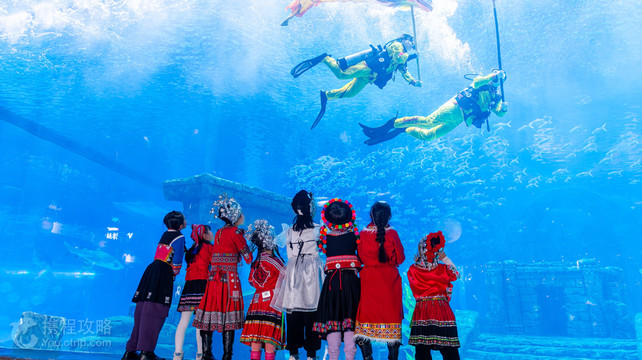 (3)全国首创水下非遗大秀震撼上演!花腰彝少女在陆上踏歌起舞,银饰脆响;水下美人鱼与绚彩长龙共舞,刚柔并济。