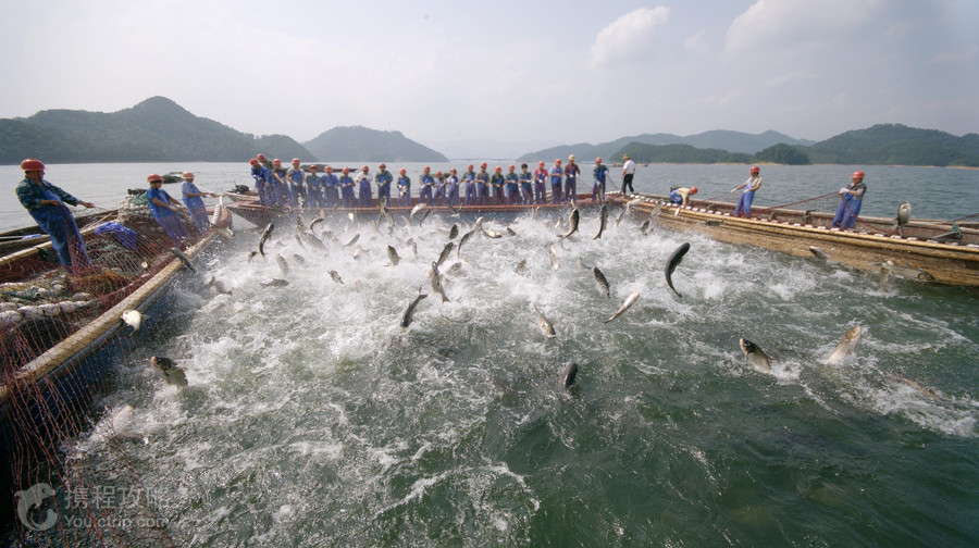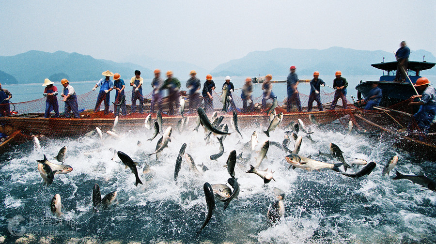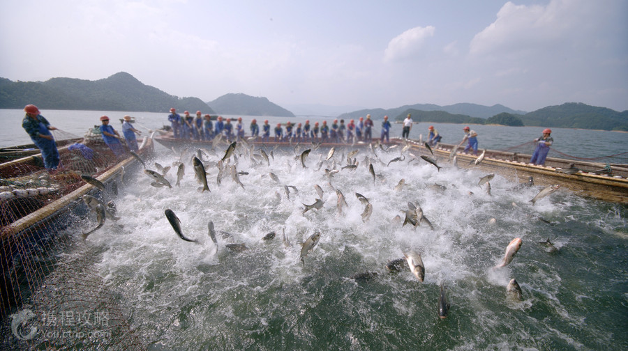千岛湖巨网捕鱼,原来是杭州千岛湖开发总公司水上捕捞队的一种捕鱼方式。曾经一网捕捞高产量是34万公斤,捕捞大的鱼是青鱼75.5公斤,是目前为止捕获的大的淡水鱼。千岛湖巨网捕鱼主要采用三种网具:第一种是拦网(拦网长4000米,高65米)主要是用来包围湖中的鱼群。第二种是丝网,它的主要功能是驱赶鱼群进入埋伏圈的。第三种是张网,俗称畚斗网,也是我们所说的埋伏圈了。
