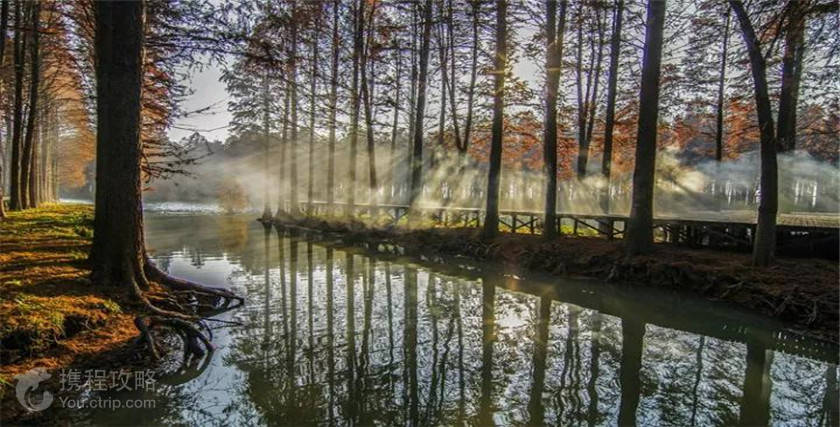 李中水上森林公园是人工生态林。公园原为荒滩,上世纪80年代初,当地干部群众为合理开发利用荒滩资源,将这里的荒滩开发成一条条垛格,栽种适应水中生长的池杉、水杉等树木品种,林中间种艿芋、油菜等经济作物。如今栽种的10万余株水杉、池杉等品种树木已长成高大茂密、生机盎然的水上园林,这个天然大氧吧是都市人回归自然的好去处。 李中水上森林公园一般由以下两种玩法结合: 木筏漂流 进入李中水上森林公园,左侧便有一个渡口,可以由此乘坐木筏。缓缓漂流在河道间,看两旁大片的池杉、水杉扎根于水中,屹立而起、高耸入云,俨然一片绿色水上森林。林中鸟类品种繁多,有猫头鹰、野鸭、白鹭、黑杜鹃、草鹦鹉、喜鹊等,树梢上的鸟巢随处可见。林中鸟平时有3万多只,最多时有6万多只。也许在不经意间便会惊起林间水滩上栖息的水鸟,展翅飞起的鸟儿引得许多摄影爱好者举起相机抓拍。 徒步游走 “林中有水、水中有鱼、林内有鸟”是李中水上森林公园的公园的特色。跟着公园内导游牌的指示,游走在小九寨沟、板桥栈道、难得糊涂林、步云桥、林中水巷等景点间,阳光透过树叶一丝一丝洒落,林间阵阵清风吹过,不时传来鸟儿婉转的鸣唱。林中还有水上小木桩,可以行走其上,体验水上漂的感觉。在雾森幻境中,将净化后的地下水通过高科技装置进行雾化,将3500平方米的森林营造出烟雾缭绕的意境,夏天来此避暑再适合不过了。 餐食 在李中水上森林公园中的红膏木屋渔村中品尝苏北水乡美食,若恰逢大闸蟹肥嫩期,还能品尝到正宗的兴化红膏大闸蟹哦。