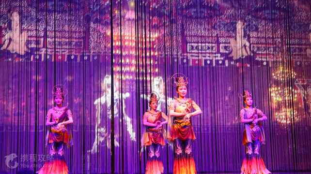 《乐动敦煌》是由中宣部支持,甘肃省委宣传部策划,甘肃演艺集团总监制、出品的全球首部洞窟式沉浸体验剧。作品溯源敦煌文化,借助对莫高窟壁画、藏经洞古籍的深度解读梳理,活化敦煌古乐器、古乐谱研发成果,采用全息投影、3D威亚等高科技手段,以全沉浸式的呈现方式,演绎了西域少年白氏追寻艺术的动人故事。剧中运用了五弦琵琶、排箫、莲花阮等民族乐器及敦煌仿制乐器音色,演绎了胡旋舞、腰鼓与琵琶舞、迦陵频伽舞等多种敦煌舞蹈,配合取材自敦煌古乐谱和西域曲调的剧目乐曲,还原了敦煌壁画中的乐舞盛景,全面展现了敦煌传承千年的古乐文化魅力,带给观众一场全方位的视听盛宴。作品编创:《乐动敦煌》剧目涉及文学、音乐、舞蹈、编导、舞美灯光、服装造型等众多专业领域,在编创团队上汇聚了多位各领域的艺术家精英及敦煌艺术文化研究专家。为了在再现敦煌乐舞诗画之魅力,编创团队多次深入敦煌当地考察研究,在剧本构思、音乐编曲、舞蹈编排、多媒体视觉设计、服装造型、舞美灯光设计等方面精巧构思、匠心呈现,充分展现敦煌文化的壮阔盛景和恢宏气势。剧场形式:《乐动敦煌》的剧场设计突破了传统剧场空间维度的限制,在莫高窟735个洞窟的基础上,开创性打造了一个“活的”第736窟,通过复刻石窟内藏经洞、佛龛、莲花台、藻井的特色形制,结合从壁画中活化的乐舞盛景,打造一个可看、可听、可游走、可互动的沉浸式洞窟剧场。剧场总面积达18000平方米,为全球首座洞窟式沉浸体验剧场,是现代科技和敦煌艺术的完美结合。观演方式:《乐动敦煌》剧场是一个没有界限的巨大舞台,分为ABC三大观演区,每个区域都承载着不一样的观演体验。在整部演出中,观众跟随剧中主角白氏的移动轨迹,或行走、或站立、或坐看,由浅入深地探索剧场各个空间,循序渐进地了解全剧故事情节。在舞美结构、科技手段、数字技术的配合下,既能感受到强烈的视觉震撼,也能体验到逼真的洞窟穿越,让观众的感官情绪在观演过程中不断起伏变化,零距离地感受敦煌艺术中诗、舞、音、画的璀璨繁盛,享受艺术体验。演艺模式:《乐动敦煌》剧场在具备了各项声光电和机械设备的基础上,打破了人和舞台之间的界限,让观众置身剧场,更近距离地欣赏演员表演,体验光影变化,感受表演者、音乐、光影之间的交汇融合,真正实现了音乐的沉浸、光影的沉浸、表演的沉浸和心灵的沉浸,这在传统剧院内是无法实现的。故事梗概:西域白氏,怀揣着对音乐的执着追求,随西域公主陪嫁至中原,被中原文明的华彩瑰魅所吸引,不断融合中原和西域音乐元素,形成了新的宫廷宴乐。在一次上元观灯时节,白氏偶遇踏歌少女,却因人海茫茫无法相识。黯然之下,白氏游走至敦煌莫高窟,不料被壁画中博大精深的艺术所震撼,随之抛却杂念,投身艺术,迎来自我升华,并长留敦煌鸣沙山。寓意人生在世,需阅遍千帆,历尽纠葛,才能砸碎欲望的桎梏,洞悉世界的真相,获得内在的觉醒,并修得超脱一切、转寰自如的能力与智慧。剧情介绍:第一章:《源起妙音》——西域音乐的演绎大唐初年,西域白氏年少得名、睥睨众生,但那无法捕捉的鸟鸣声让他陷入巨大焦虑之中,他决定跟随西域使团前往中原觐见,为自己打开全新的世界。第二章:《乐动丝路》——中原礼乐的演绎途经敦煌时,白氏被壁画中瑰丽广博的音乐世界和神秘乐谱所震撼,决定暂留此地钻研,进而萌生融合东西方音乐精髓的梦想。第三章:《上元踏歌》——中原俗乐的演绎敦煌绚烂的上元灯会,让白氏走进久违的人间至味,人们对幸福生活的渴求让他心生慈悲。繁华散尽,面对壁画,白氏陷入独思之中,恍如融入其中。第四章:《盛世华章》——敦煌音乐的演绎敦煌壁画中,比人间少女更优美的翩然飞天,比上元灯会更绚烂的燃灯踏焰,以及那苦苦追寻的妙音鸟的天籁之音,都纷纷相遇。当这一切汇聚在一起,白氏终于明白,深藏功名的忘我献身、天上人间的悲欣交集,才是艺术创作的辽阔境界。独对朗月,琵琶一曲,这位追梦前行的少年,终于在敦煌创作出告慰一生的作品,实现了融合东西方音乐的恢弘梦想。
