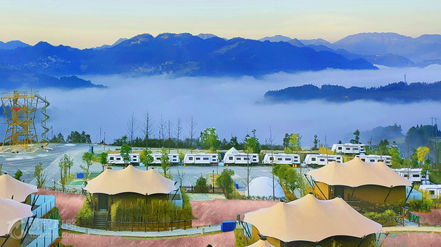 位于距离苗族聚居村寨西江千户苗寨500米的半山腰上,山隐西江野奢露营地 坐落于此。露营地共10辆房车与15间玻璃篷房,隐趣休闲房车按照按照星级酒店标准配套,豪华松软的大床、高低床组合,开放式厨房、独立卫浴、会客厅。房车门口还配有的遮阳伞与小桌椅,贴心程度满分。隐悦帐篷房,半山腰上独立的一屋一间,房间里的巨大落地窗,拉开窗帘看到的便是云雾窝在山间的震撼景色,苗银打造的床头灯向我们诉说着这个民族的独特文化。