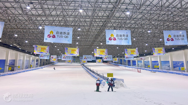 绍兴启迪乔波冰雪世界是浙江仅有一家可提供四季滑雪的运动场所,以大型室内滑雪馆、真冰溜冰场为主,滑雪馆设有儿童戏雪乐园、单板公园、初级滑雪道、中高级滑雪道等四项设施,可满足单板、双板爱好者的不同需求。滑雪场内通过人工造雪和制冷技术,即使是炎炎盛夏,馆内始终保持在零下三度左右。主场地分练习区、中级道和高级道,高级道都是教练和学员,散客要通过考试才能上魔毯,否则只能徒步上下。入口处附近还有儿童区,可以和雪人合影,比较有意思。在此滑雪按场次收费,每场为4小时,滚动计时不清场,超时会收取一定的超时费,务必注意游玩时间。门票包含雪服、雪鞋、雪板租赁费及15分钟的免费教学,但头盔、衣柜等则需另付费租赁,价格在每场10-20元不等。雪场提供的衣服虽然免费,但一般比较脏,若是介意可以自带。如果你是初次滑雪,建议找教练指导你玩(需另付费)。虽然场地内不算太冷,但滑雪手套和帽子还是必要的,没有租赁,如果没带可在滑雪场购买,30元左右一套。如果对雪地自行车感兴趣,可以租一辆,请教练指导你玩。餐饮方面,馆内的快餐厅主要为客人供应中西式套餐自助;中餐厅经营粤菜等中式点餐;而拥有落地观景窗的运动酒吧则让客人在欣赏滑雪现场表演的同时,细品现调咖啡的芳香以及各类西式小吃。另外,这里还配有舒适的桑拿中心,可为滑雪归来的疲惫身体做一个彻底放松。如果条件允许,建议在工作日前来,此时不仅人少,而且价格便宜。