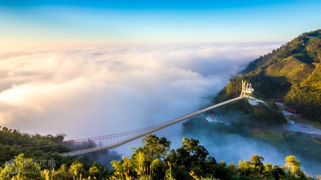 太平云梯横越太平山与龟山,是国内最长单跨人行吊桥,村民称龟背山为龟山,36湾为蛇山,五连峰为龙山,太平四面环山,为莲花宝穴。现今看到的太平公路是日治时期由近四万民力,徒手开辟,是嘉义山区最早开 辟的公路,并于1986 年拓宽。沿途槟榔树、龙眼树各类植物蓬勃夹杂生长,天气晴朗时还可俯瞰云嘉平原的壮丽美景。吊桥全长达281公尺,海拔约1000公尺,为游客提供了一个俯瞰嘉义风光、观赏夕阳晚霞的好的视角。踏上太平云梯,可以感受到山间清风拂面,视野开阔无遮。无论是晴空万里还是云雾缭绕,它都呈现出不同的美景。晴天时,可以远眺嘉南平原的广袤大地,村落稻田尽收眼底;云雾弥漫时,桥身仿佛悬浮云端,让人仿佛步入仙境。太平云梯的设计也十分人性化,桥面采用木栈板,既安全又方便行走。桥中央的镂空铁架设计,让游客可以透过铁架俯瞰脚下的绿野,增添了探险的趣味。周围茶山的翠绿与天际的蓝色交相辉映,为游客带来一场视觉盛宴。