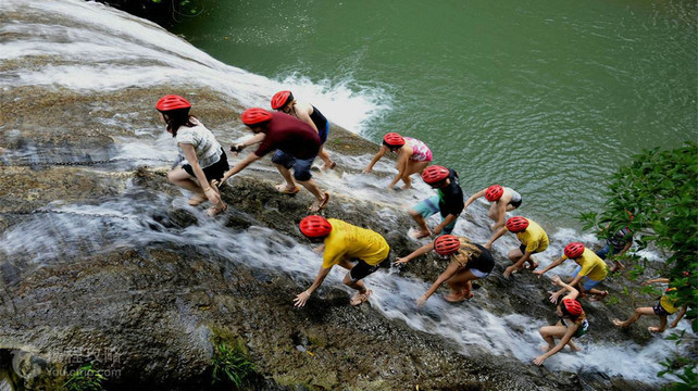 桂林古东景区位于桂林市灵川县大圩古镇南,景区内有地下涌泉汇集形成的多级串联钙化瀑布群。桂林古东景区比较特色的地方在于,园方在山石上开凿了很多石坑,配合铁链,可以攀爬,可让人尽情体验溯水而上的乐趣。进门后可以坐竹筏渡过三姐湖,再步行一段路就到了瀑布脚下。攀爬瀑布需要换上统一的装备一草鞋和安全帽。攀爬整个瀑布群大约需要30分钟,瀑布水流有缓有急,是很安全的。衣服被打湿是必然的,水路的终点旁边有更衣室,当然,如果是夏天过去,可能本身不一会儿衣服就干了。不喜欢水路的,也可以走旱路,后走山路下山,不过来此,大部分的人群还是选择水路的。除了攀爬瀑布亲水、坐竹筏、过荡桥,桂林古东景区本身的环境和空气也很好,它的枫树很多,美的时候是秋季,它是一处满种枫树的山林,每年到了深秋(11月-12月左右),这里层林尽染,枫叶红艳艳的连成一片十分壮美,枫林中有一座空中的吊桥,这个吊桥,它距地面高度大于有50米以上,也是桂林古东景区欣赏红枫的观景点。