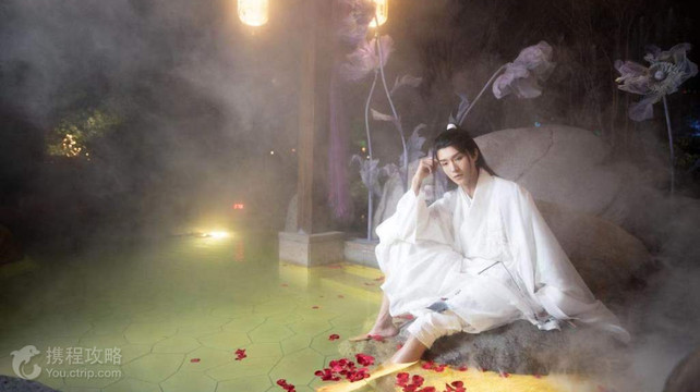 云澜湾温泉室外汤池区以精致造景、诗意情境为特色,将东方园林景观与西方精神疗养融合,可以说是“一池、一景、一诗、一意境”。根据不同养生功能,室外温泉区划分为九大特色区六十个汤池。九大区分别是:四象星座区、五大莲池区、六合养生区、七星邀月区、八卦木桶区、琼浆美肤区、别有洞天区、德式水疗区、童游水乐区,在这些区内,分布有幽澜古泉、云澜瀑布泉两大特色泉以及六十个功能各异的温泉池和私密汤屋,提供丰富多样的泡汤体验,原汤系列、花草系列、果蔬系列、中式系列、美食系列、美酒系列、茶文化系列等特色汤池,养生养心、养颜养肤,清新自然,随心所浴。 温泉中心水疗大厅,是马尔代夫的星空。特色的星空顶,唯美的装饰,无处不在的马尔代夫风情,令人有掬之入怀的冲动,椰林树影,星光如画,交织成一个海岛般的浪漫之夜;美丽、宁静的景致,呈现出悠闲、常乐的海洋风情。星空穹顶下,拥有恒温泳池、儿童戏水池、50多种功能的水疗池(从人体力学及科学保健的角度,为客户提供从头、颈、肩、背、腰、臀、腿、脚整套的水疗服务),更有:沙浴、水晶蒸房、盐蒸房、能量石蒸房等,养生疗养的同时,享受不一样的温度和湿度乐趣。