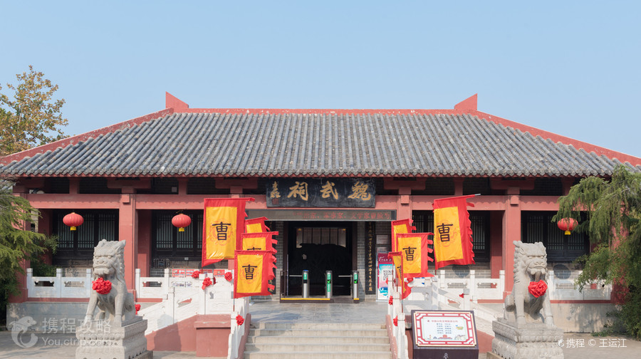 魏武祠(原曹操纪念馆)位于曹操公园内,是以三国时期伟大的政治家、军事家、文学家曹操为主题,以其纵横捭阖、极富传奇的一生为主线,着力展现三国历史文化的专题性纪念场所。纪念馆整体为一组三进式仿汉风格的建筑群,目前陈列内容有曹操生平简介、魏武祠、三曹诗碑长廊,曹操蜡象及展品等,于2009年建成,总建筑面积2200平方米,反映曹操政治、军事、文学方面的千秋功业。曹操,字孟德,小字阿瞒,汉族,沛国谯(今安徽亳州)人。中国东汉末年著名的军事家、政治家和诗人,三国时代魏国的奠基人,后为魏王。其子曹丕称帝后,追尊他为魏武帝。曹操一生征战,为全国尽快统一,在北方广泛屯田,兴修水利,对当时的农业生产恢复有一定作用;其次,他用人唯才,打破世族门第观念,抑制豪强,所统治的地区社会经济得到恢复和发展。此外,他还精于兵法,著《孙子略解》、《兵书接要》《孟德新书》等书。作为一代枭雄,他精通音律,善作诗歌,抒发政治抱负,并反映汉末人民苦难生活,慷慨悲凉。