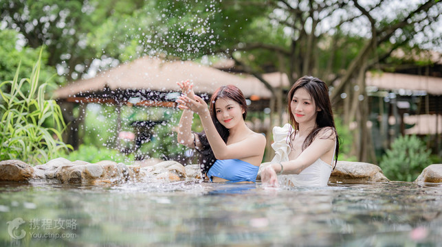 河中温泉占地4.8万平方米,共有形态、水温、大小各异的20多个温泉池,是国内以东方园林风格为主的大型露天温泉。温泉至清至纯,可饮可浴,水温由38°C至60°C不等,出水量高达11000多立方米。