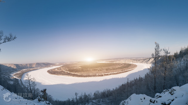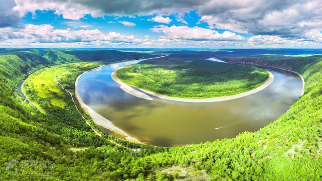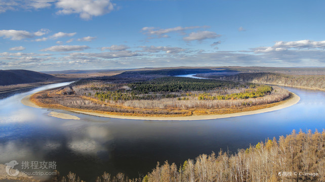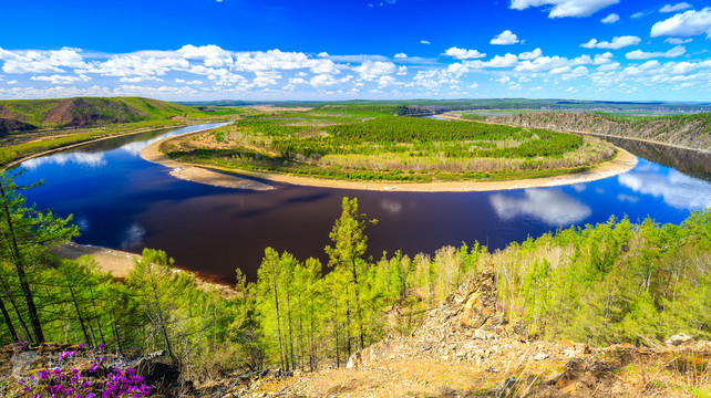 龙江第一湾风景区位于漠河市,中俄界河额尔古纳河在漠河县洛古河村西北15公里处与俄罗斯方向流过来的石勒喀河汇合后就成为黑龙江源头,滚滚黑龙江水从这里为起点沿着内外兴安岭交界处的低谷一路东流150公里后在一个叫红旗岭的地方突然拆成一个Ω形江湾,这个长度达30公里的神奇大湾就是黑龙江第一湾。