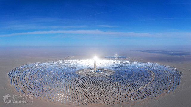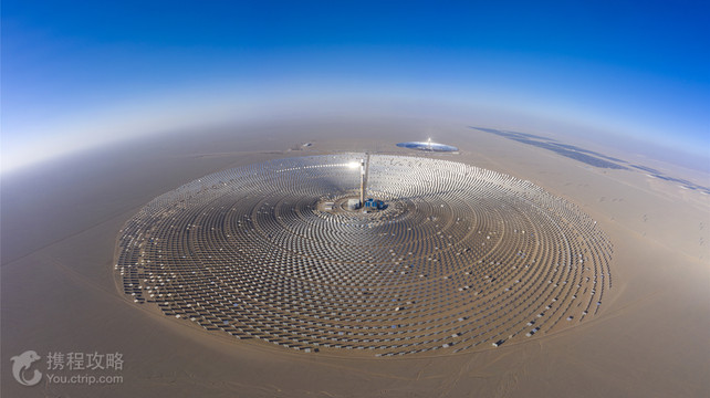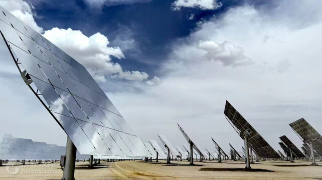敦煌是古代丝绸之路上一笔浓墨重彩的颜色,有着灿烂的文明,辉煌璀璨。更是由于这里特殊的地理位置,在这一片大漠黄沙之中,敦煌乃是我国太阳辐射量较大地区之一,年日照时间为3257.9小时,日照百分率为75%,年太阳辐射量为6882.57兆焦耳/m2,敦煌沙漠面积大,可利用面积大。适合建设大型光伏并网电站的沙漠戈壁面积约3500平方公里,潜在装机容量1.2亿千瓦。光电产业发展潜力巨大。在215国道以北的戈壁滩上,当地特色的敦煌光电博览园(超级镜子发电站)发展成为了西线游客游览之地。独特的自然条件使敦煌成为国内光电产业发展之地,总规划面积254平方公里,敦煌的气候条件、施工条件、电网输出条件和其他优势注定敦煌光电行业未来的行动。这也是这片土地的光荣使命。 tips: 这是由一万两千面镜子(小镜子四十二万面)组成的“景区”,是现实与科技的碰撞,是沙漠和戈壁的结合智慧。