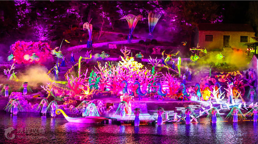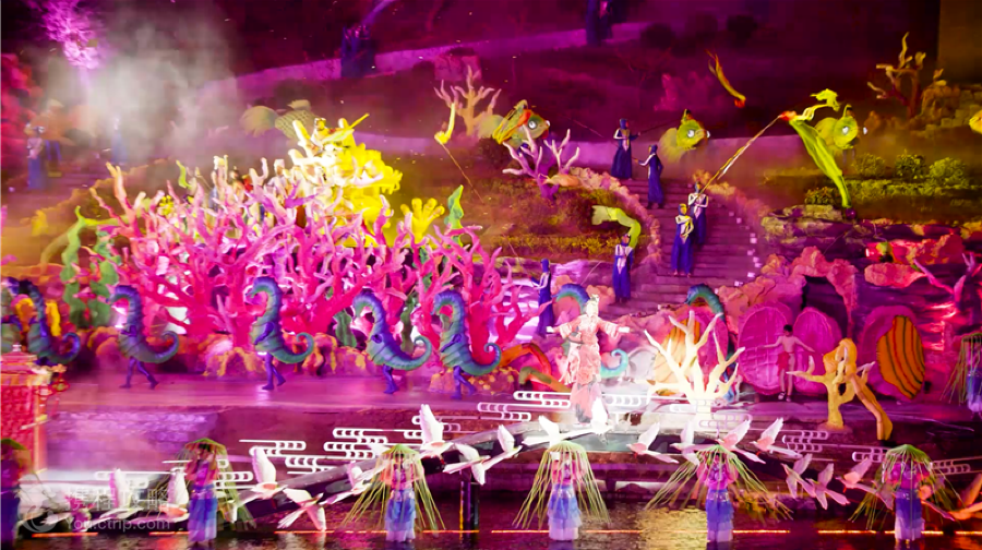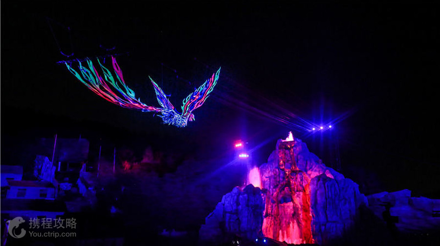 会跑的实景演艺!真山真水的沉浸式舞台!360度旋转的移动式看台!环绕水陆空的全方位表演!打破单一舞台演出模式的束缚,置舞台于自然山水天地之间,剧场以观众为中心,巨轮观众席前后运行,360度旋转,四周为不同山水形态的大舞台,山水相连,人与自然融为一体,让会跑的移动式看台带领观众去体验水、陆、空全方位的跨时空精彩演艺。开创了自然景观与人文景观相结合的实景演艺先河。《神游传奇》秀生动展现华夏五千年文明精髓。故事分序幕和六章正篇,讲述盘古开天地以来华夏大地的各种离奇故事和传说,分别是天赐华夏、先祖部落、凤凰涅槃、八仙贺喜、东游求仙、神龙腾飞、天佑华夏。后羿射日的坚忍不拔,嫦娥奔月的美轮美奂,大禹治水时山洪暴发、火山喷发的雄伟壮观,世外桃源的碧波荡漾、小桥流水,龙腾虎跃的宏大气势,太平禅寺前的盛世繁荣,一幕幕实景大戏浩瀚拉开,观众坐不离席就可以欣赏到水、陆、空全方位360度环绕的跨越时空的精彩演艺。