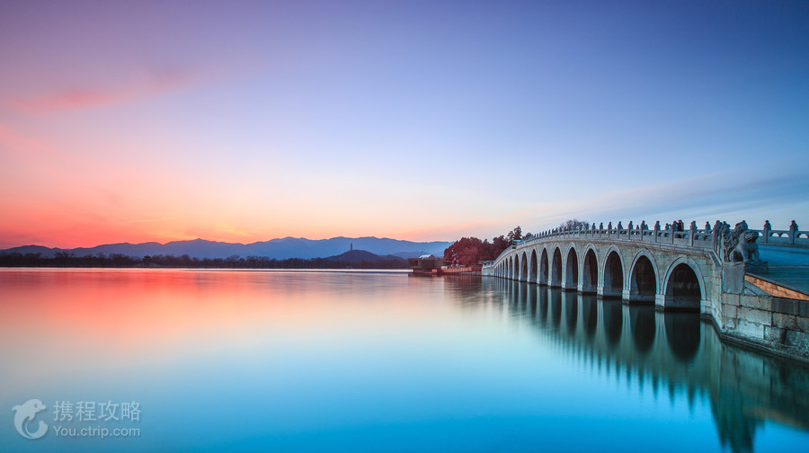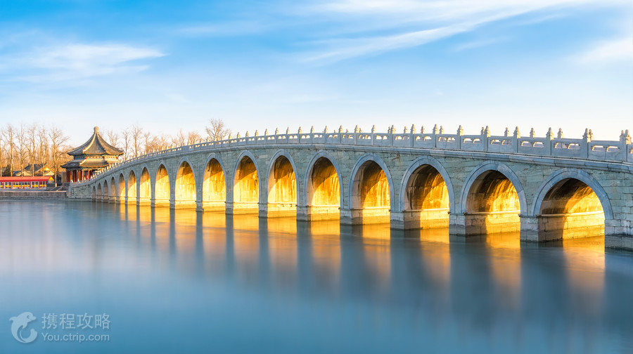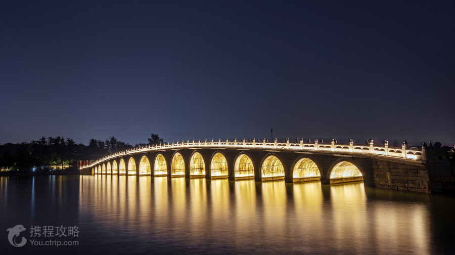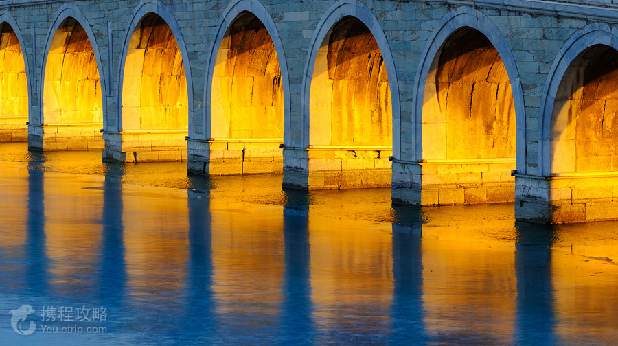 十七孔桥横跨在南湖桥和东岸之间,长150米,仿造的卢沟桥而建。桥由17个孔券组成,每个桥栏杆上都雕刻有形态各异、造型精美的石狮子,大大小小共544个,数目据说比卢沟桥的还多。日出日落时,是令摄影爱好者较兴奋的时刻。