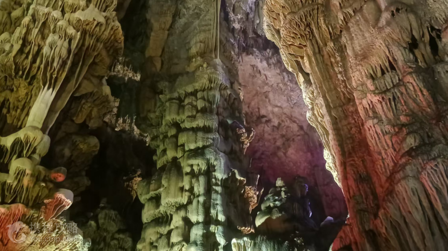 从远处看仙女洞的外形就像簪子一样,洞内一直保持恒温,洞内有很多像珍珠一样的岩溶结晶体,很壮观。