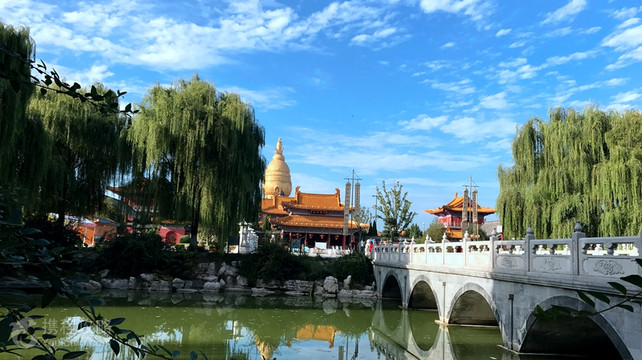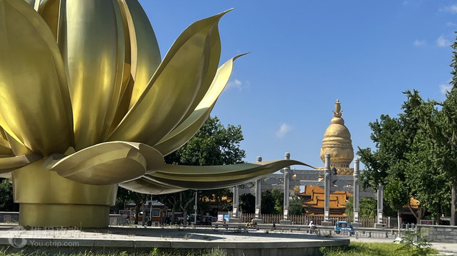 宝相寺位于汶上县城西北隅,现为国家AAAA级旅游景区,亦是我国著名的佛教文化旅游圣地。 景区核心景点宝相寺始建于唐朝,原名昭空寺。宋咸平五年(公元1002年)更名为宝相寺,大中祥符元年(公元1008年)被赐封为皇家寺院。历经千年,寺院香火延续,是齐鲁大地上的重要佛寺。 寺内宝相寺塔(又称太子灵踪塔)建于北宋徽宗政和二年(公元1112年),为十三层八角楼阁式砖塔,距今近千年。因塔顶覆盖金黄色琉璃瓦,阳光照射时呈现金色外观,当地俗称“黄金塔”。