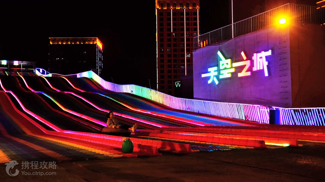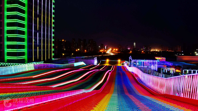 天空之城游乐场位于塔坛国际商城西区北侧,是一处休闲娱乐的新晋网红游乐场。游乐场内有玻璃栈道、彩虹滑梯、蹦蹦云等娱乐设施,很适合亲子游乐。除了娱乐设施外,这里的夜景也是一大亮点。当黑夜渐近,绚烂的灯光将游乐场装扮的如梦似幻,彩虹般的灯带宛若璀璨星河,营造出浪漫酷炫的观赏体验,让人沉醉其中。