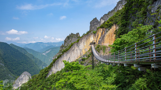 武陵山大裂谷景区位于重庆市涪陵区城东南约40公里的武陵山乡境内,系国家4A级旅游景区。景区面积29.96平方公里,平均海拔1300米,山势奇骏多姿,原生植被丰富,种类繁多,共有2000余种野生植物和200余种野生动物;空气清新宜人,生态环境极其优良,山、林、泉、洞、瀑、崖、湖、潭、峡、坑、缝一应俱全,旅游资源极为丰富。十里大峡谷雄阔壮美,谷底奇石叠垒,溪流淙淙;天然绝壁宛如万里长城,绵延数里;地缝、暗河神奇壮观。景区以地球上古老的“伤痕”—剧烈地壳运动所致绝壁裂缝称奇。世界奇特的近距离反向地质构造——天门奇险,状如薄刀,铜墙铁壁连绵千米,令世界各国地质学家称奇叫绝。 游客中心: 武陵山游客中心,按照国家5 A级旅游景区标准设计和建设,大气磅礴、风格典雅、功能完善。整个游客中心由游客接待大楼、游客集散广场、生态停车场三部分组成。占地近200亩,建筑面积1.5万平方米。 云雾阁: 云雾阁所在位置海拔1200米,因一年四季云雾缭绕而得名。是武陵山大裂谷景区又一绝 佳观景平台。天气晴朗的日子,云消雾散的时候,从这里可以望见百里之外的武隆县弹子山,甚至连弹子山上风力发电站的一架架风车也清晰可见。从云雾阁俯瞰景区,可谓云蒸霞蔚、如诗如画! 天门洞索桥: 两公里范围内大规模横向、纵向、反向地质构造带奇观,其状如薄刃锋利无比,铜墙铁壁连绵千米,令世界各国地质学家称奇叫绝。更是被国家地理杂志评选为全国100个推荐拍摄点之一。 云梦溪: 走进溪流淙淙,桃李芬芳,田园牧歌的桃花源般古朴村寨,在此悠闲小憩,品武陵特色美食,不亦乐乎。 古月坊: 古乐坊建于绝壁之下,溪流之上,与两岸青山相依,形成“高山流水遇知音”的布局。在这里,陈列着历史悠久的巴渝古乐器,展示了独具风情的巴渝歌舞,让您穿越时空,感受巴国故都音律的永醇魅力! 祈愿谷: 绝壁舍身崖之下,百年福树与亭台楼榭相映相衬,喝一碗“摔碗酒”,将寄托着满满良愿的祈愿带系在福树上,悠享林间静谧祥和,许下今生美好愿望。 青天峡地缝:被誉为地球古老的“伤痕。”全长1500米,平均深度300米以上,深达600米;极窄处不足2米触手可及,是地貌与亿万年地壳运动共同作用的结果。于此拨云见日,偶遇心中的一米阳光。 武陵泰斗: 42.6度极限坡度,垂直落差约300米,斜长634米,一索彩厢斜逸而出,寻芳探幽,千寻峡色尽收眼底。
