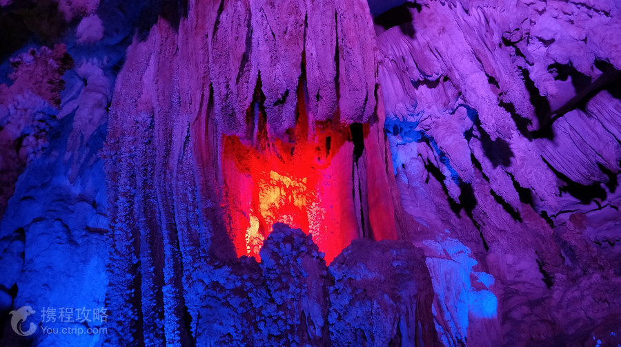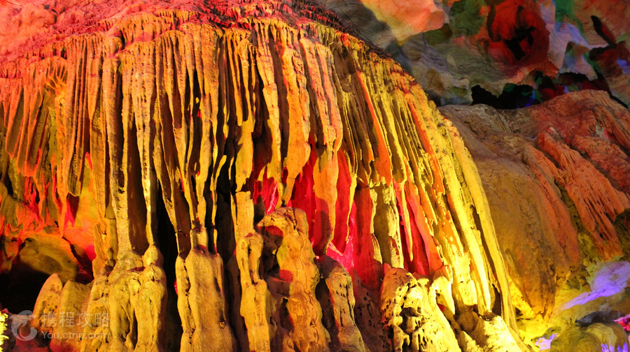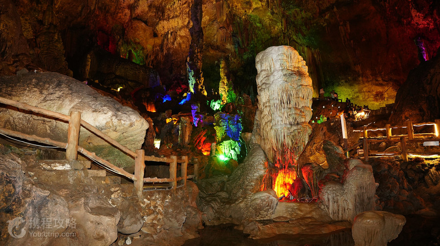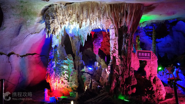 夜郎洞位于安顺市镇宁县境内,与黄果树瀑布、石头寨相邻,是世界上喀斯特地貌集中的溶洞群景区,相传夜郎王曾居住于此而得名。溶洞群由石花洞、蜂子岩洞等大大小小溶洞和天坑、燕峰斜崖等独特的喀斯特地貌共同组成。夜郎洞的洞口为一巨大天桥,伏流从洞中涌出。溶洞高百米,分三层。第一层为水洞,二三层为旱洞。第一层水洞蜿蜒曲折,船行其上,但见两岸岩溶形态各异,石柱、石钟乳、石笋密布,蔚为壮观。第二层旱洞由5个大庭组成,依次布满人形石钟乳和石花、石柱,灯光下交相辉映,五彩斑斓。神奇的是一丛丛怒放的石“灵芝”,枝繁叶茂,从茎部到叶尖闪闪发光,颇为奇特。第三层旱洞高大开阔,洞中石笋密密匝匝,仿佛进入了原始森林,舒适惬意。大量岩溶发育似树,树冠伸展,荫及面广,灯光下五彩斑斓,有置于天外天的感觉。