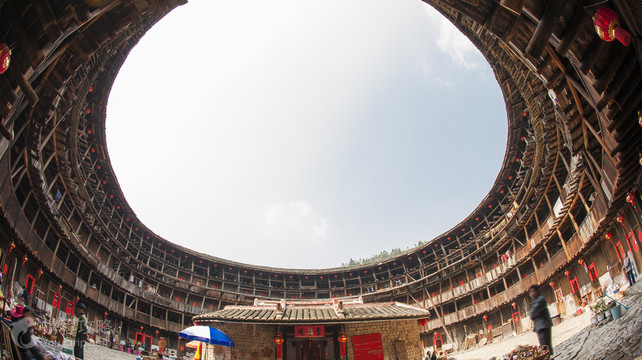 狮子山观景台是河坑土楼群的观赏处。站在狮子地冻山顶可以从三个方位看到不同造型的三个土楼群共有27座。在右前方的一片开阔地与山坡连接处,座落着7座土楼,分别是河坑土楼群-东升楼、河坑土楼群-晓春楼、永庆楼、春贵楼、绳庆楼、南动楼和永荣楼,这就是“北斗七星”。河坑土楼群坐落在狮子山前,两条溪流在左边山脚下交汇,形成了河坑村的地理结晶“丁”字水。走在河坑村高大林立却带有泥土烟火气息的土楼群中,有归隐田园的恬静。河坑土楼群都以河卵石堆砌为基础,加以泥土磊成墙体,约三四层高,刀削般峭立。这些土楼都是封闭式的,底层只有一个大门,门楼皆是石板材,半圆拱顶,大门栓都是6寸见方一丈来长的硬木直插墙内,没有2人无法伸缩开启楼门。二、三楼外墙台有开窗均匀分布,错落有致。河坑土楼群中间是个天井,周围平均分割成若干格子,每格4米宽,3米多深,这是房间,大的土楼,如河坑土楼群-东升楼、春贵楼、裕昌楼每层有36个房间,可以住100多人,圆楼的房间呈现斧头现状,站在天井张望,酷似一只高大的木桶,颇有坐井观天之感。