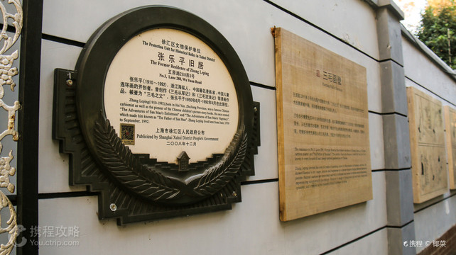 五原路288弄是一条普通的小弄堂,弄堂里的3号是一栋近代独立式花园住宅。著名漫画家张乐平在这里生活了五十多年,并在此绘制了大量美术作品,其中《三毛学雷锋》、《三毛爱科学》等一批“三毛复出”之作也是在此诞生。从五原路288弄弄口望进去,一整墙的“三毛画壁”引人注目,四格漫画的样式一路呈现着经典的“三毛”形象,黑色的篱笆墙引人走向弄堂深处,深色的原木大门边上,“张乐平故居”字样的木质门牌朴素中跳脱着色彩。张乐平心爱的一株紫藤从一楼花园攀缘至二楼阳台。一座真人大小的三毛穿新衣雕塑树立在花园一角。这栋楼原先住着两户人家,张乐平先生家在二楼,就是如今呈现的生活空间的样貌,一楼很自然地做成了文献陈列。一楼的展厅面积不过百多平方米,就是在这百多平方米的空间里,布置呈现了百年乐平、大师漫画、艺苑掇英、朋友画我四个展厅,既有丰富的文献、实物资料可纵览大师一生重要节点。二楼的生活空间里,张乐平先生的书房、卧室、其子女的卧室等游客都可进入室内观览。