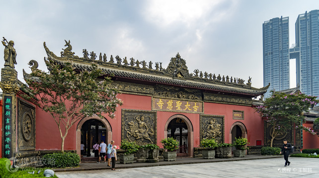 大慈寺据今己有1600多年,古称“震旦第一丛林”。该寺以壁画著称,唐代吴道子、前蜀李升、后蜀黄筌等都在此作有壁画,寺中所藏碑石书法墨迹也丰富。苏轼誉为“精妙冠世”。据记载,唐代名僧玄奘法师奘曾在这里受戒、讲学。寺内有一个不大的玄奘纪念馆。 历史上的寺院,曾经规模宏大,如今所见的这座寺院,是清代重修的。山门殿上方“古大圣慈寺”石匾刻于光绪六年,距今已有120多年,各殿堂石柱上,刻有清代名士顾复初等撰书的楹联。 寺内还设有素斋和茶馆,从这里可以步行到达春熙路。