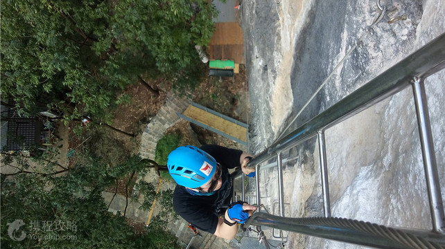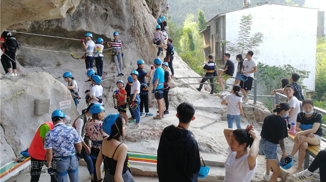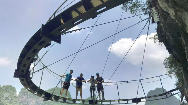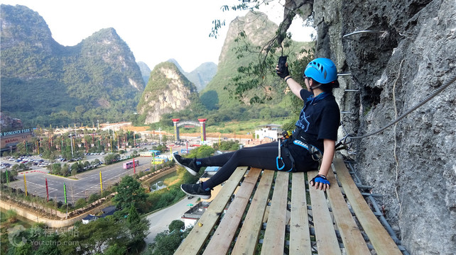 飞拉达攀岩基地位于桂林市阳朔县遇龙河生态公园门口,线路包含绝壁垂直上攀,下攀、侧攀横渡、绳索攀登,有两种U型脚踏扶手。线路集高空猴桥、索桥、天梯、溜索、环形观景桥等多种攀登形式,让活动参与者体验全新的高空极限运动。高空猴桥:在岩壁上悬空架起一段高达40米的木板拼接成的断桥,人在行走时完全悬在空中,要和上下小伙伴保持良好的节奏,或许也可以一起荡过去。环形观景桥:到达高处时,一个直径跨度达8米的半圆形观景台可以让你稍事休息,这里不仅能居高临下欣赏山水地貌,还能将对面的宋城千古情演绎净收眼底,休整后还能与队友一起各种造型摆拍,不管是朋友圈还是短视频平台都能获得无数点赞。高空溜索:长达400米,高50米的两段溜索让你真正的飞一次(一次不够?那就再来一次!)是你一生都很难体验到的心跳感觉。