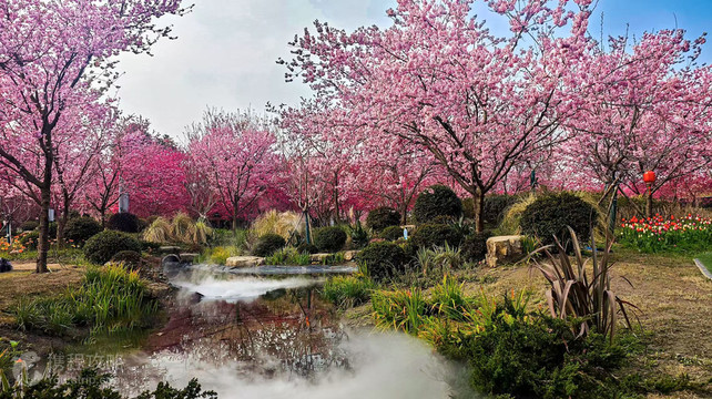 绛樱院是一处集樱花观赏、文化体验和休闲娱乐于一体的大型公园。园区内栽植50余个樱花品种,其中以国宝级“兰兰樱花”由为珍贵,这种象征中日友好交流的独特品种,粉白渐变的花瓣如云似霞,每年初春绽放时吸引无数游人驻足。得益于特殊气候与品种搭配,赏花期从2月中旬持续至3月中旬(具体视气候微调),早樱,中樱,晚樱,数千株樱花次第盛放,形成连绵不绝的粉色和红色海洋,被誉为“天府之国”的樱花天堂。游客不仅可以漫步在樱花海洋中,享受赏花乐趣,还可以在景区内的茶楼品茶休憩,或带上露营装备,在湖边撑开帐篷,享受阳光和自然的美好。此外,绛樱院还提供了丰富的休闲娱乐设施,如划船、骑马等,适合各年龄段的游客前来游玩绛樱院是一处集樱花观赏、文化体验和休闲娱乐于一体的大型公园。