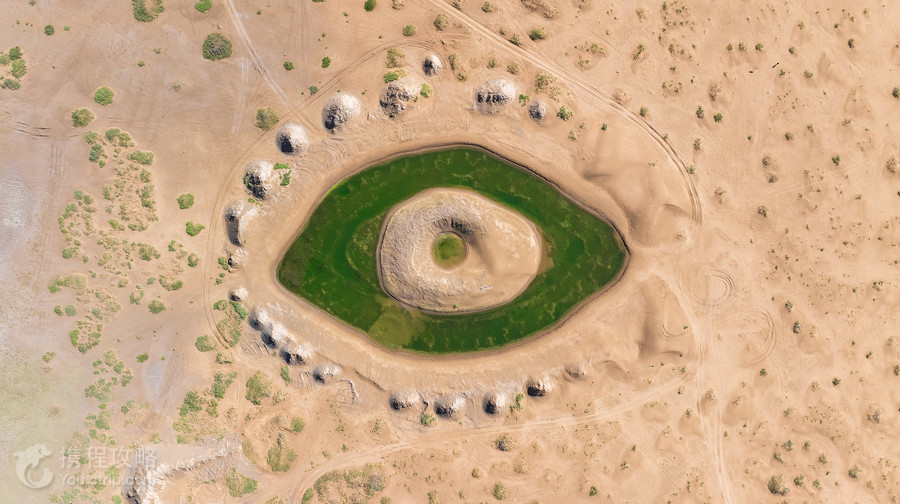 腾格里沙漠龙眼翡翠湖位于中国内蒙古自治区阿拉善左旗的腹地,是一处由自然形成的小型盐湖。因其湖水在阳光照射下呈现独特的翡翠绿色,宛如沙漠中的“绿眼睛”,故得名“”。 腾格里沙漠龙眼翡翠湖的湖水碧绿如翡翠,清澈见底,在阳光下闪烁着神秘的光芒,仿佛一颗巨大的宝石镶嵌在沙漠之中。这种独特的颜色是由于湖水中的矿物质和微生物共同作用形成的。湖泊的形态宛如一只巨大的眼睛,与周围的沙漠景观形成了鲜明的对比,构成了一幅令人叹为观止的自然画卷。尽管位于沙漠之中,但腾格里沙漠龙眼翡翠湖的生态环境却相对较好。湖中生长着一些水生植物,为湖泊增添了几分生机与活力。同时,湖泊也是一些鸟类的栖息地,为它们提供了宝贵的生存空间。 站在腾格里沙漠龙眼翡翠湖旁,可以欣赏到湖泊与沙漠交织的壮丽景色。湖水碧绿如翡翠,沙漠金黄如绸缎,两者相互映衬,构成了一幅美轮美奂的画卷。游览通常需要穿越沙漠,这是一次对身心的挑战。游客可以乘坐越野车在沙漠中疾驰,感受沙漠的壮阔与神秘。同时,也可以徒步穿越沙漠,亲身体验沙漠徒步的刺激与乐趣。腾格里沙漠龙眼翡翠湖是摄影爱好者的天堂。无论是湖泊的碧波、沙漠的灰沙还是天空的蓝天白云,都为摄影提供了不二的背景和元素。游客可以在这里拍摄到令人震撼的自然风光和人文景观。