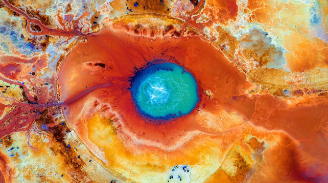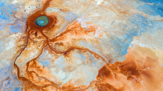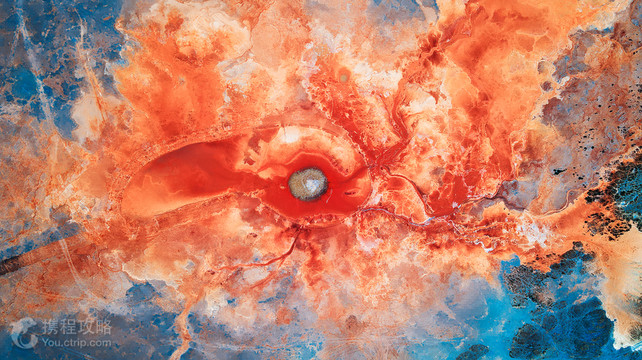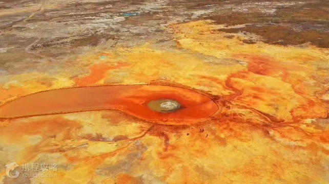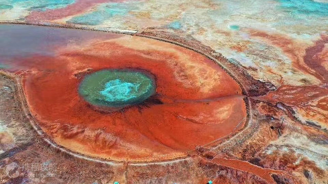 茫崖艾肯泉是喷涌千年的地热喷泉,虽然其泉水流经的地方寸草不生,但是萦绕其周围那红黄相间的草滩,红褐色的沙石,像极了一块圆形的调色板,造就了天地间一幅色彩斑斓的油画形似椭圆的艾肯泉直径就有10多米,绿色的泉水,如同沸腾的开水,咕咕上涌,奔流不息。因长期蒸发,泉水里的矿物质在土地上沉淀出深红环带状的“天眼边界”。从空中俯瞰,泉眼与喷涌而出的泉水组成了“大地瞳孔”的造型。脉络清晰,栩栩如生,在摄影爱好者的镜头下,宛如一只振翅高飞的凤凰。 茫崖艾肯泉是由两个相距四百步的涌泉组成,各自周围形成相当深的小湖,西边那个湖是一个矿泉湖。在大泉周边点缀着许多青色的小泉眼,为天青色的盈亏小泉,如小行星围着太阳。在泉水的四周,踩上会发出咔哧咔哧的声音,土质十分疏松一不留神便可能陷进去。