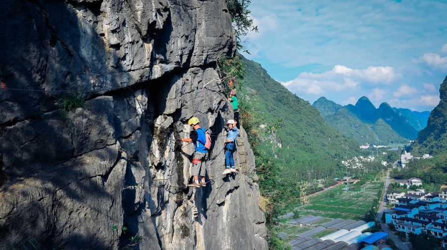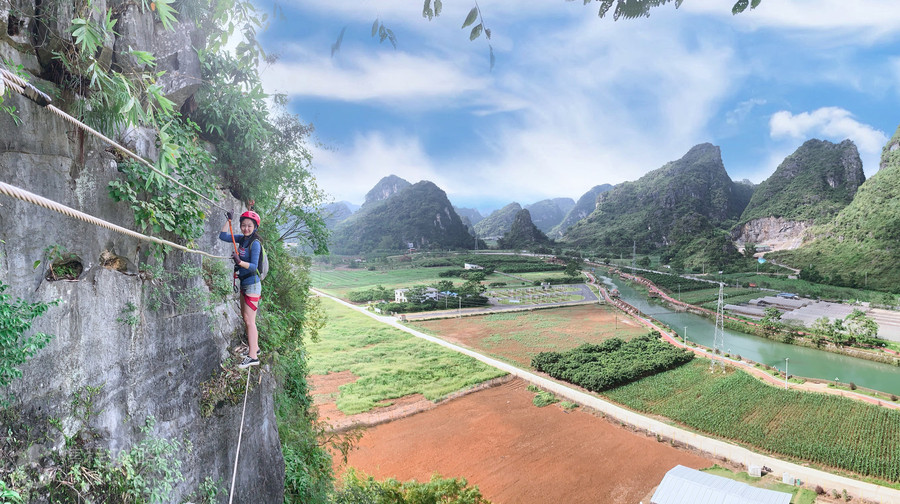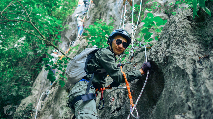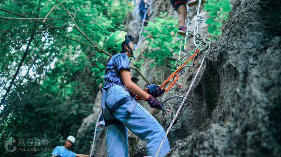 飞拉达是意大利文ViaFerrata(意为铁道式攀登),指的是在山面上建设,由铁扶手横梯、固定缆索、岩石塞、踏脚垫等构成的爬山径道,让爬山者不会攀岩也能攀上陡峭的岩壁。这里的线路分为1号线与2号线两段。1号线高垂直落差60米,2号线高垂直落差120米,相当于40多层高楼的高度。全长800米,是目前广西境内长度长的飞拉达线路。