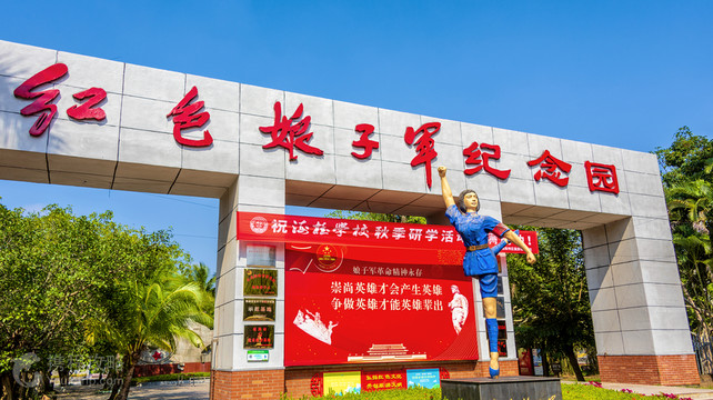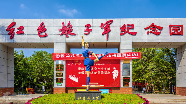 红色娘子军纪念园位于海南省琼海市嘉积镇,是为纪念第二次国内革命战争时期诞生的中国工农红军第二独立师第三团女子军特务连而建设的红色纪念场所,教育示范基地、国家国防教育示范基地、全国廉政教育基地、全国妇女教育基地、海南省总体国家安全观教育基地、海南省关心下一代党史国史教育基地。红色娘子军纪念园于2000年5月1日建成,2021年启动修缮改造和改陈布展,2023年9月23日修缮完成并免费对外开放。主要设施有红色娘子军纪念馆、红旗广场、和平广场以及游客中心等。红色娘子军纪念馆建筑面积3588平方米,现有的《战地琼花——红色娘子军主题陈列》为纪念馆的基本陈列,展陈面积1760平方米,展线长度300米。分为两个部分,第一部分为女子军特务连战地纪实,第二部分为《红色娘子军》经典流传,全面展现了中国工农红军第二独立师女子军特务连的革命历史和红色娘子军相关经典文艺作品。