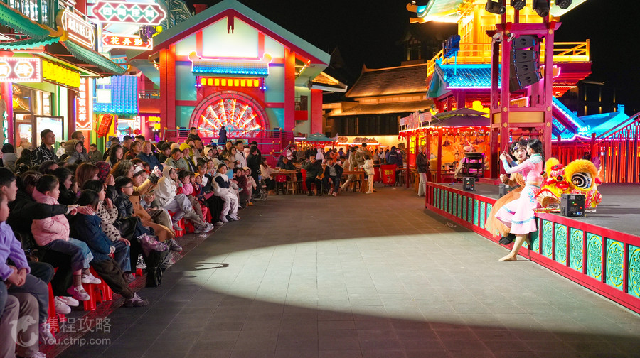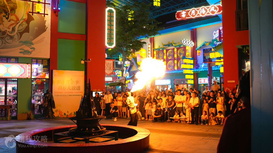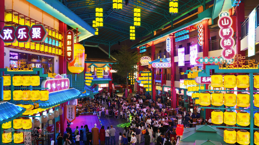 熹乐谷不夜山谷街区,位于国家4A级旅游景区——清远熹乐谷温泉旅游区内。作为熹乐谷全新开发的夜间文化和旅游消费集聚区, 一年多以来,不夜山谷吸收借鉴西安大唐不夜城文旅融合的成功经验,进行融合创新,通过布局综合性旅游业态、推出精品夜间商业产品、打造特色文化体验活动等举措,推出一座集演艺、小吃、游玩、打卡、拍照、互动一体的创新式融合唐风沉浸式街区,迅速受到游客和周边市民的欢迎。
