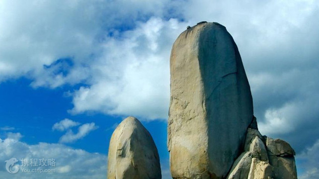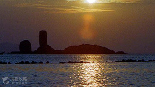 在平潭县西北端苏澳镇西侧的海面上有一块圆盘形大礁石,它托着一高一低的两块碑形海蚀柱,整体看起来就像一艘大帆船。两块巨石像两面鼓起的风帆,船似乎正在乘风破浪前进。这是平潭知名的自然景观——石牌洋,又称为“双帆石”。
