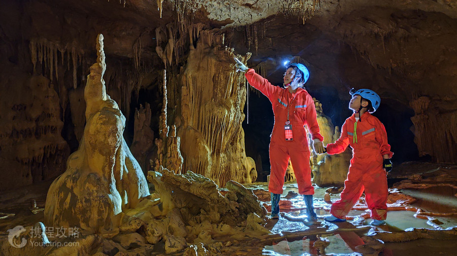 【欢迎来到七洞空间——喀斯特地貌的时光秘境】【喀斯特地貌的诞生密码】各位探险者,欢迎踏入黔南深处这片未被雕琢的自然奇迹——七洞空间。黔南地处云贵高原东南部,2亿年前曾是浩瀚古海洋。随着地壳抬升,富含碳酸钙的石灰岩层暴露地表,雨水溶解空气中的二氧化碳形成弱酸性水流,自上而下渗透、溶蚀、沉淀……历经千万年,终成这蜿蜒曲折的溶洞群。这里是地球用亿万年时光雕刻的“地下艺术宫殿”,是喀斯特地貌原始的密码本。七洞空间之名,源于洞内七个自然形成的溶洞而得名,堪称“喀斯特地貌教科书”。请跟随我们的脚步,以敬畏之心揭开它的神秘面纱,感受水与岩的史诗对话。首先我们要先了解喀斯特溶洞的形成,总体来说分为三个阶段自然界的雨水在下落的过程中,常常会吸收空气和土壤中的二氧化碳而带有酸性。当这些带有酸性的雨水渗到地下石灰岩裂缝里时,会对石灰岩产生溶解作用,天长日久,地下水退却,石灰岩随之被地下水带走,就形成了奇妙的溶洞。那么我们刚才讲到一个词:石灰岩,只有石灰岩的地质才能形成溶洞,其它还有花岗岩,玄武岩,火山岩等。那么石灰岩是怎么形成的呢?第一阶段:先要有“石头原料”几亿年前,大海里堆满了贝壳、珊瑚这些生物的尸体,它们的主要成分是碳酸钙(类似粉笔的材料)。时间久了,这些尸体被压成厚厚的岩石层,就是石灰岩。后来地壳运动,海底变成山地,石灰岩也就被抬到了地面上。第二阶段:雨水当“酸水”慢慢溶石头雨水不是纯水,它会吸收空气中的二氧化碳,变成“弱酸性水”(类似很淡的醋)。这种酸水顺着石灰岩的裂缝往下渗,像用酸慢慢泡石头一样,把石头里的碳酸钙溶解带走。这个过程持续几万年,裂缝越溶越大,然后在地下挖出弯弯曲曲的“地道网”,这就是溶洞的雏形。第三阶段:溶洞里的“装修工程”当地下水位下降,溶洞变得干燥时,神奇的事情发生了——之前溶解在水里的碳酸钙又开始变回固体。七洞空间由来第一洞:星穹之眼第二洞:碧波瑶池第三洞:灵犀迷宫第四洞:石瀑深渊第五洞:地脉之心第六洞:云梯裂隙第七洞:蜂巢谜窟第一洞厅 | 星穹之眼"苍穹垂落的天光剧场"天然圆形洞口穿透洞顶,直径约8米的光柱倾泻而下,雨季时水流沿洞口石檐形成环形水帘。晨昏时分阳光斜射,洞内蒸腾的水雾折射出七彩虹晕,岩壁上古生物化石在光影中若隐若现,如星际文明的密码图腾。第二洞厅 | 碧波瑶池"大地坍缩而成的翡翠酒樽"自然塌陷形成的椭圆形坑洞直径逾20米,千年渗水雕琢出阶梯状池台。三叠池水色彩迥异:上层池澈如琉璃,中层泛祖母绿幽光,底层呈墨玉色神秘水域。池畔倒悬钟乳石群形似龙饮,雨季时地下暗河涌动声如远古埙鸣。第三洞厅 | 灵犀迷宫"洪荒巨灵倾覆的棋局"倾斜30度的穹顶下,一根直径超20米的巨型石柱轰然倒伏,交错构成天然迷阵。卧倒石笋长达22米,表面布满螺旋状生长纹,断裂截面可见34层矿物沉积环带。穿行其间需手脚并用攀越石障,转角常遇倒挂石盾形成的天然拱门。第四洞厅 | 石瀑深渊"岩石熔铸的冰封瀑布"左侧整面岩壁被高约50米、宽达80米的钙华石瀑完全覆盖,水流痕迹在石幔上凝固出浪涛肌理。石瀑底部延伸出锐利石刃群,其下方探测到深度超百米的裂隙深渊,贴壁而行时能感受来自地底的气流漩涡。第五洞厅 | 地脉之心(洞中洞)"大地脐带连接的秘境"从第四洞壁隐藏的狭缝匍匐进入,穿越8米长的曲折通道后豁然开朗。中央矗立着直径4.2米的通天石柱,柱体布满珊瑚状晶簇,柱基与穹顶石盾形成完美力学平衡。洞壁渗出的含铁水流在石柱表面蚀刻出血脉状纹路。第六洞厅 | 云梯裂隙"岩层撕裂的立体诗篇"200米高的垂直裂隙将山体一分为二,两侧岩壁裸露着17层不同地质年代的沉积带。石瀑群沿裂隙错落分布,高处达20米的巨型石幔形似登天云梯,石髓凝结的晶花在缝隙微光中闪烁如星屑。第七洞厅 | 蜂巢谜窟(不对商业团开放)"悬空秘境的时间胶囊"攀越第六洞垂直岩壁抵达的未开发领域,上千条石膏幔从30米高的穹顶垂落,形成乳白色结晶帷幕。石幔后方隐藏着三个嵌套式洞窟,深处钟乳石群呈现罕见的靛蓝色泽,石笋表面保存完好的滴蚀坑记录着近一次地质活跃期的降雨频率。【洞穴奇观——水与时间的艺术展】-洞穴术语1. 钟乳石:大地的“年轮”科学奥秘:洞顶渗水携带碳酸钙,遇空气二氧化碳逸出,钙质以水滴为中心逐层沉淀,形成倒悬的冰锥状钟乳石。视觉奇观:观察洞厅中央的“白玉华盖”(高3米),其表面环状纹理如树木年轮,每一毫米的生长需20-100年。顶部仍在滴落的水珠,正是“活钟乳石”的证明。互动思考(研学提示):用手电筒侧光照射,可见半透明质感,这是高纯度方解石的标志。2. 石笋:向上生长的“生命”形成机制:钟乳石滴落的水珠在地面溅开,碳酸钙再次沉淀堆积成笋状石笋。标志景观:“通天塔”(高8米,位于第5洞内,需要低头进入洞厅):洞内石笋,底部直径3米,顶部与钟乳石仅距30厘米,预计万年后将连接成石柱。“天使之翼”:密集分布的小型石笋群,形似破土竹笋,可清晰观察到叠层结构。亲子互动:寻找形似蘑菇、宝塔的趣味石笋,测量不同区域石笋高度,思考滴水频率与生长速度的关系。3. 石柱:天地相拥的见证地质意义:当钟乳石与石笋连接,便形成顶天立地的石柱。七洞空间的“时空之柱”直径达8米,表面布满珊
