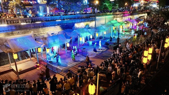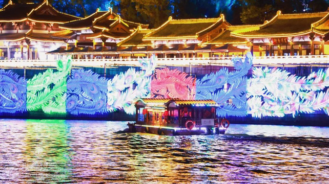《凤起利州》栖凤湖夜游演艺,以武则天传奇故事为主线,融合唐风舞蹈、情景互动与光影艺术,沿湖设置多个沉浸式表演节点,再现古利州繁华盛景。乘船夜游,穿越千年,体验一场文化与视觉的梦幻之旅。从凤翔楼前往游船之际,精心打造行浸式空间已让观众提前入戏。100多米的步行距离,演员扮成西域商贾往来穿梭,8条银丝古建的大船从画中驶来,岸上舞台开始互动表演,观众仿佛走入了一幅唐代繁华利州码头的盛世画卷,登船之际也会领到自己的“身份”腰牌。船上一个多小时的演绎设置多次互动,武士彟分享夫人怀孕的喜讯时,同时与观众问答等多个环节赠送广元茶做成的香包、嘉陵江的鱼干、猕猴桃果干等特产小吃,把看客引入剧中。行浸式体验通过可感知、可参与、可共情的体验,让游客仿佛一瞬间穿越回了唐朝,让“看戏人”成为“入戏者”,完成跨时空相遇。