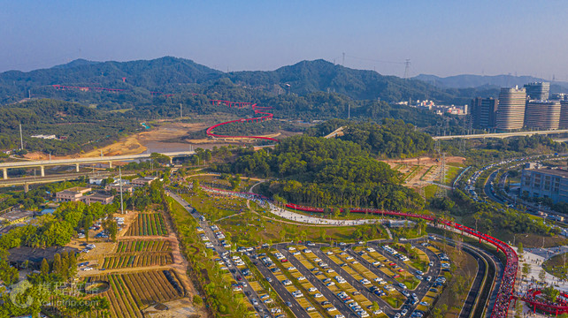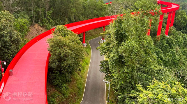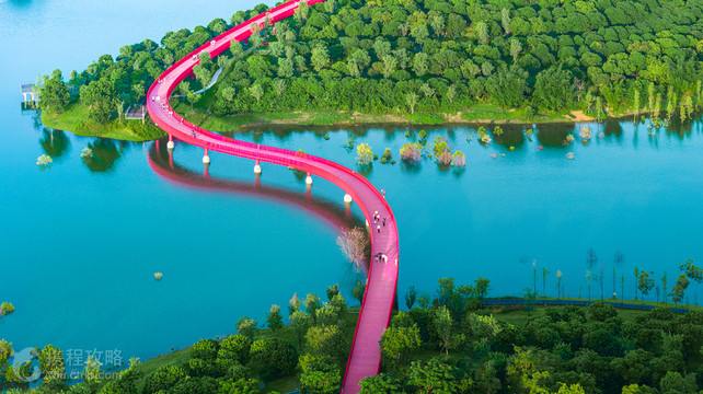 虹桥公园位于深圳市光明区,公园内钢结构单柱多曲景观桥,在绿油油的山体之中宛如缠上了一条醒目的“红丝带”, 将城市与森林紧密连在一起。公园入口两边是空旷的草坪和儿童游玩设施,健身设施,是人们休闲出游的好地方。
