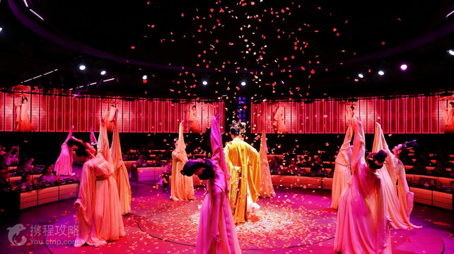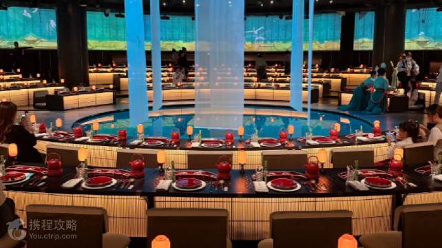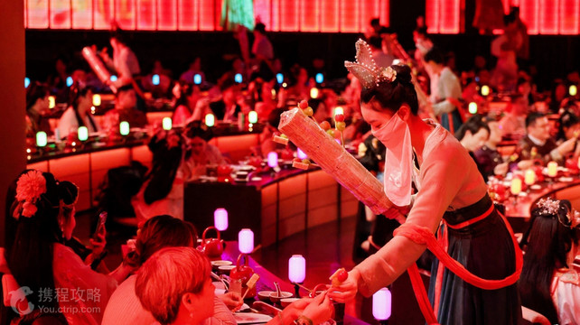 杭州宫宴是一家沉浸式文化主题餐厅,位于西湖区曙光路 122 号浙江世界贸易中心 A 座。它以 “礼食合一” 为核心理念,融合周朝礼制、宋韵文化与现代科技,为游客提供跨越千年的宫廷宴饮体验。特色演出:演出以周朝饮食礼制中的 “燕享食礼” 为历史背景,通过《燕享食礼》演艺串联整场宴会,包含祭礼、迎礼、乐礼、舞礼、艺礼、庆礼等环节。舞台装置融合声光电技术,有升降宫灯、威亚仙女等,能呈现漫天飞雪、大雨骤降等宏大场面,表演形式丰富多样,涵盖舞蹈、杂技、戏曲、独奏等,如将苏东坡的一生浓缩在一曲曲深情的吟唱中,展现其治理西湖、与妻子王弗的深情等场景。美味佳肴:菜品以周朝饮食礼制为背景,结合杭帮菜与宫廷菜,由非物质文化遗产代表性项目御膳制作技艺的第五代传承人把控出品。汉服妆造:宫宴的妆造司提供 200 余件华美汉服,涵盖魏晋、唐、宋、明等不同朝代的风格,还有丰富的妆发配饰。宾客可以选择自己喜欢的汉服,体验挽发髻、贴花黄、扫娥眉等古代妆造,仿佛穿越回古代。互动体验:宴会结束前,演员会和宾客热情互动,如 “杭州老市长苏东坡” 会来到前排问候观众,还有侍女叫卖冰糖葫芦并分发给宾客,给足食客情绪价值。