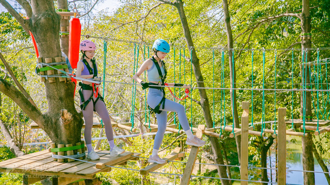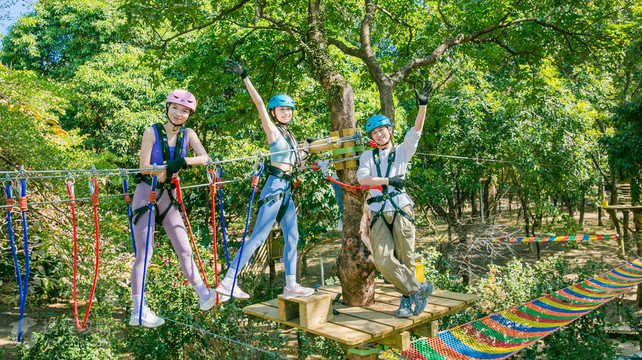 广州森吧飞越树上探险乐园,坐落于广州黄埔区龙头山森林公园内,紧邻地铁5号线庙头站,占地广阔达50亩。乐园内共设有6条不同难度的线路,分别以难度高低做了黄、绿、蓝、红、橙、金线等命名,“森吧飞越树上探险乐园”自2023年9月佛山西樵山园区开业以来,便以其独特的树上探险项目吸引了无数海内外游客。这是一项在树与树之间设立了障碍趣味关卡进行闯关探险的户外游乐项目,集探险、运动、娱乐、挑战于一体的户外探险乐园,是学生春秋游、周末亲子游、企业文化团建拓展的好选择。快来这里,释放你的压力,坚韧你的意志,锻炼你的领袖精神,开启一段难忘的探险之旅吧!!