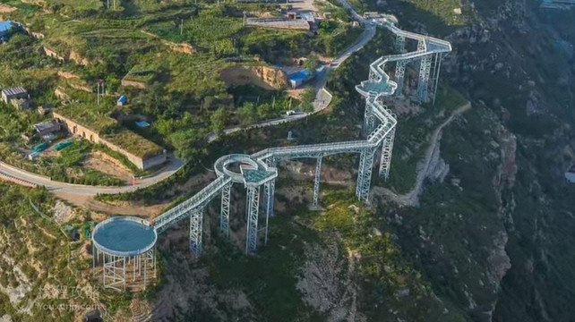 作为义门镇庙峁村依托黄河天桥峡谷优势打造的文旅新地标,凤凰古村景区以“听黄河涛声、赏晋北风情”为特色,其核心景点玻璃栈道按九曲黄河理念设计,设有“心心相印”“钻石相爱”等特色平台,仿真玻璃碎裂效果带来别样体验。夜幕降临,栈道霓虹与远处黄河水电站灯光交相辉映,构成美丽夜景,吸引游客纷纷驻足拍照。